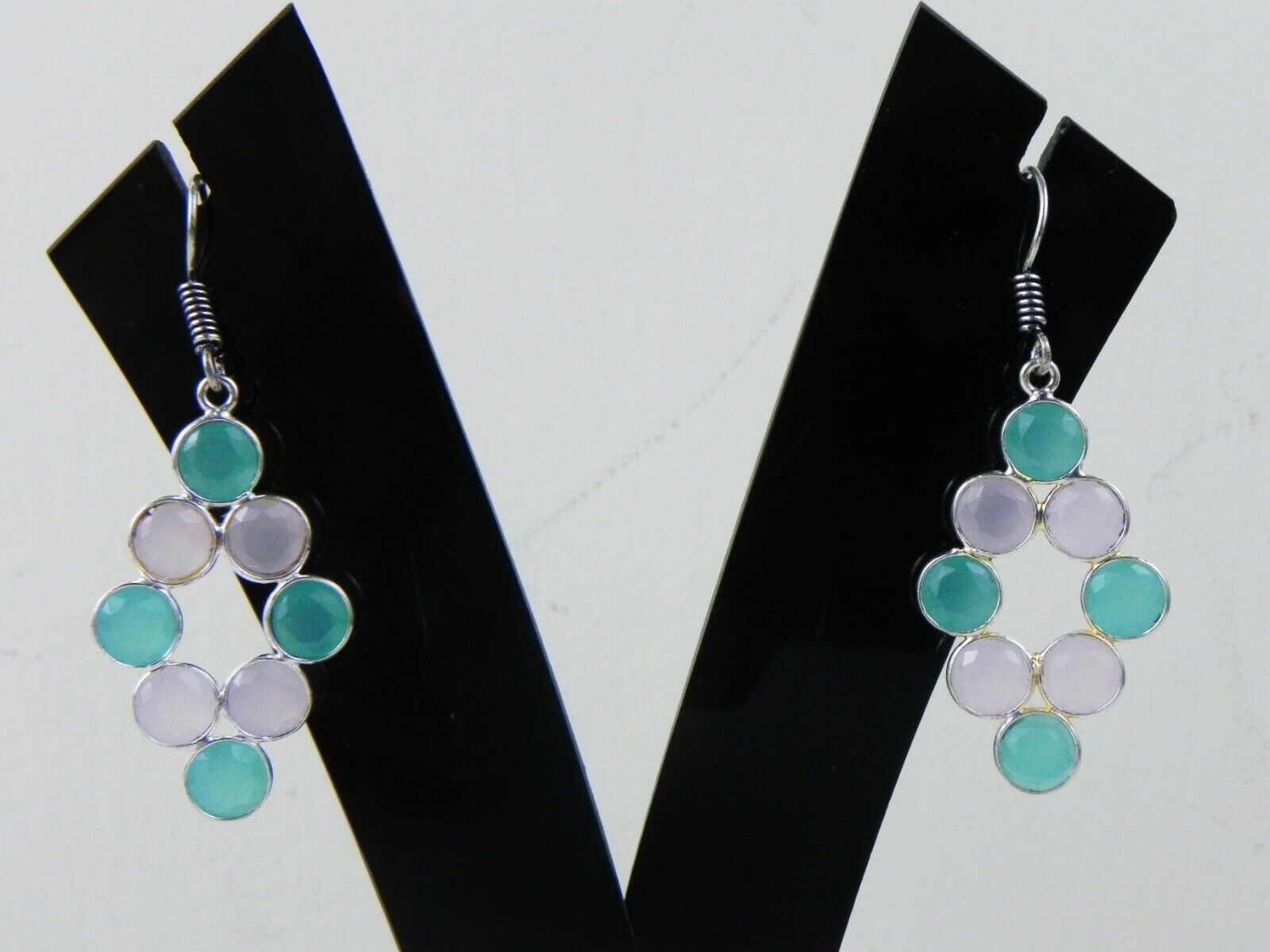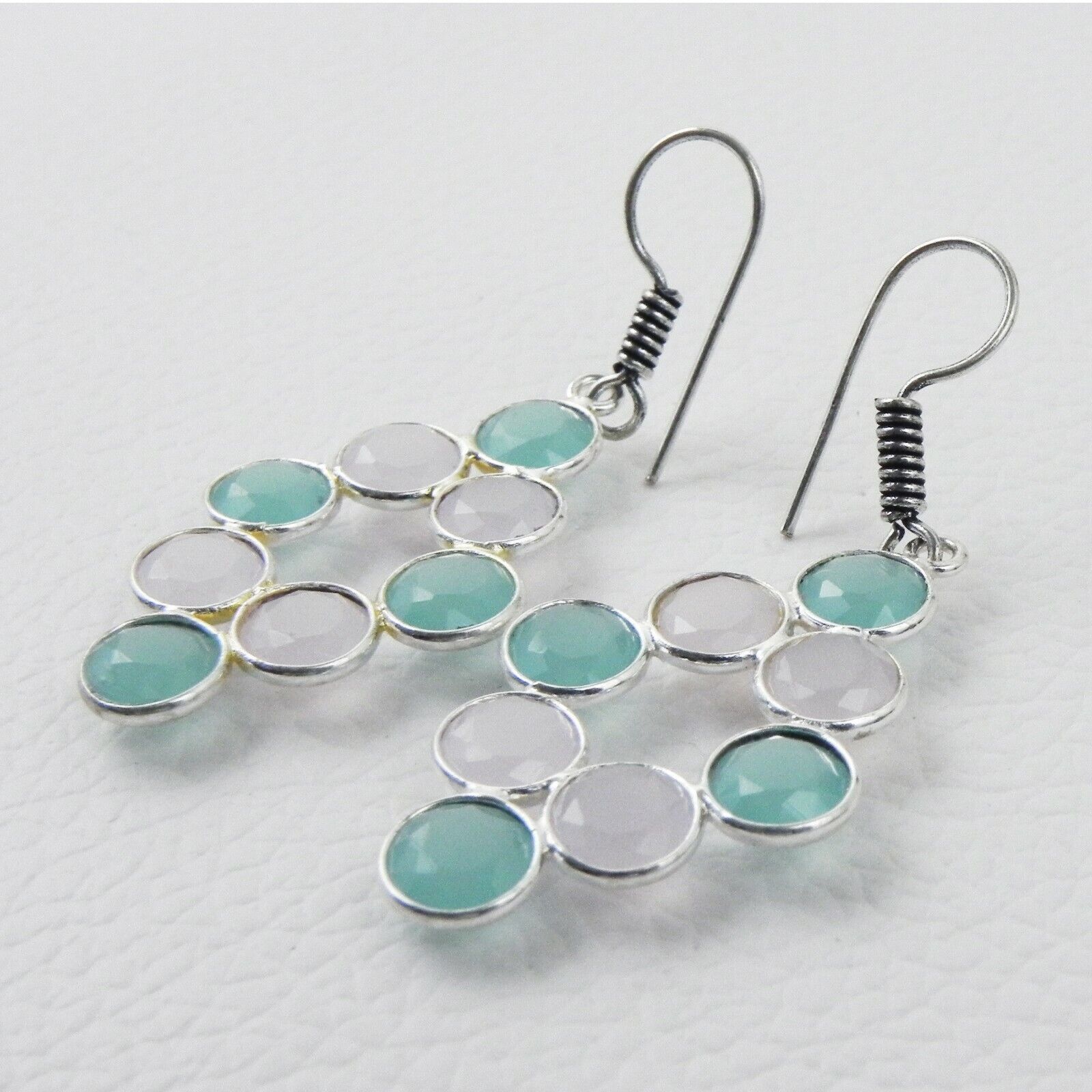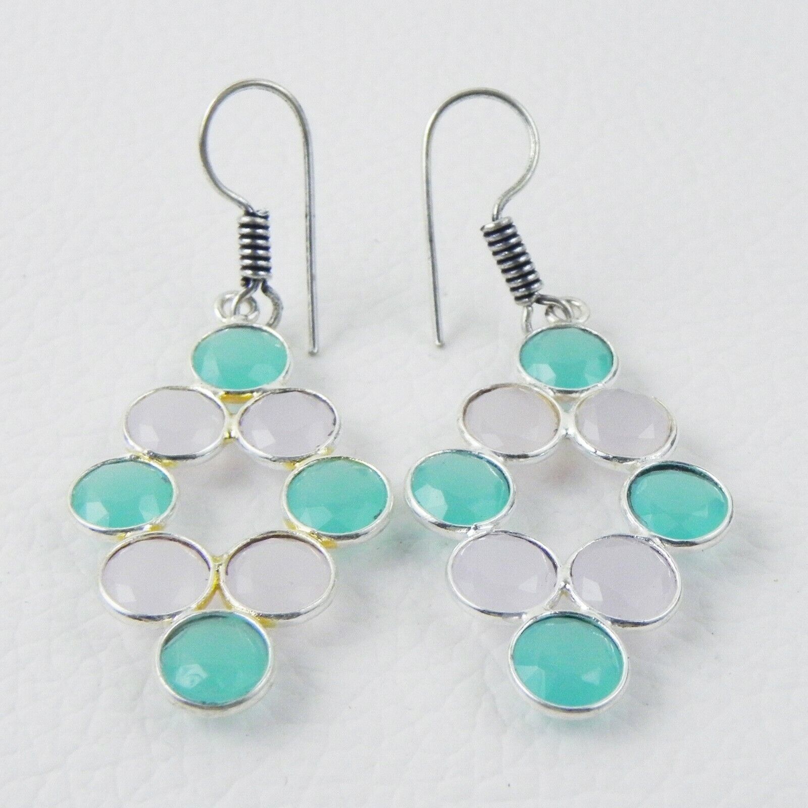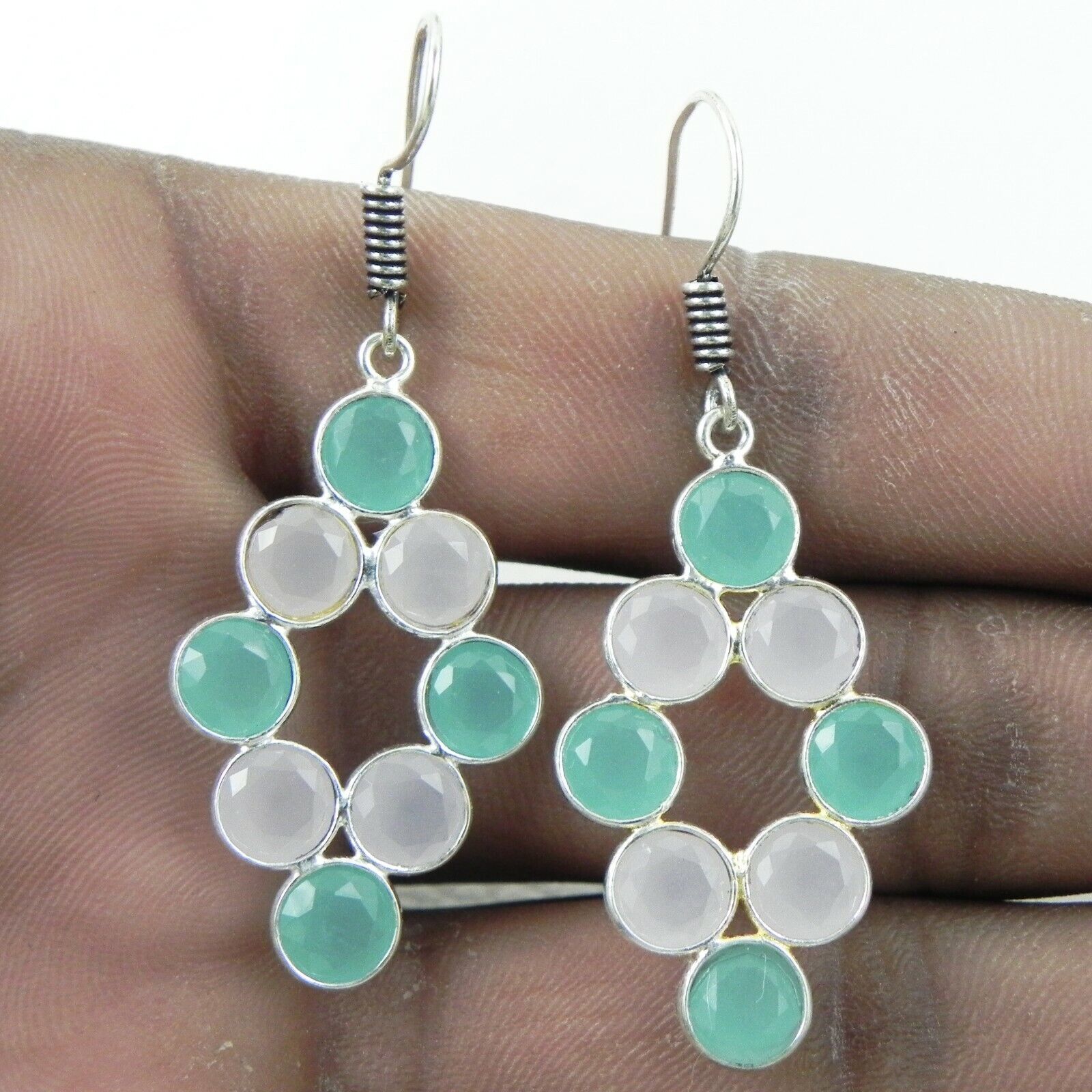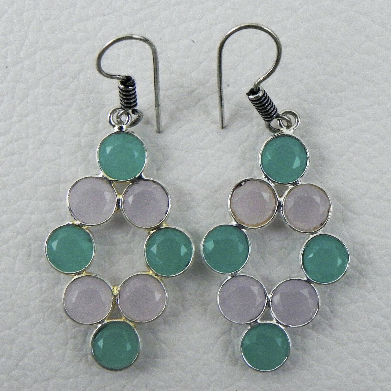925 Sterling Silver Chalcedony & Rose Quartz Gems Handmade Earrings Gift ES-1243