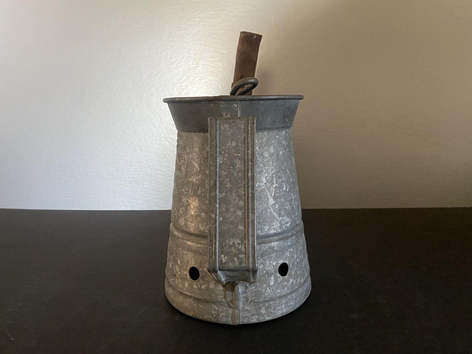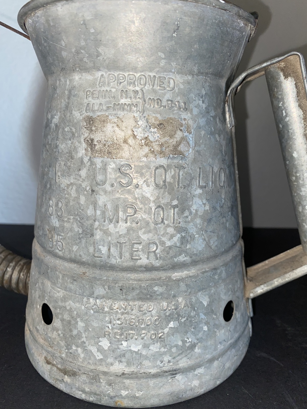 This listing features a 1940's galvanized 1 Qt. oil dispenser with an oil release bore button within. It's in Very good condition, please see our pictures.