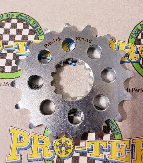 Pro-tek front sprockets are also completely CNC machined to exact tolerances from 4140 nickel-chromoly steel resulting in a quality product. None of the Pro-tek front sprockets are gear hobbed, but are lightened with drilled holes to save on rotating mass. Every lb of rotating mass equates to a 4 lb weight reduction. The sprockets are then case hardened to Rc 58-60 and finished with a zinc plating for added durability and protection from corrosion. Made in the USA, normally retail for $29.95. This is for a 530 Pitch front sprocket 16, 17, 18 or 19 tooth.