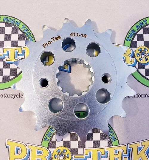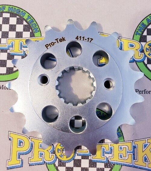 Pro-tek front sprockets are also completely CNC machined to exact tolerances from 4140 nickel-chromoly steel resulting in a quality product. None of the Pro-tek front sprockets are gear hobbed, but are lightened with drilled holes to save on rotating mass. Every lb of rotating mass equates to a 4 lb weight reduction. The sprockets are then case hardened to Rc 58-60 and finished with a zinc plating for added durability and protection from corrosion. Made in the USA, normally retail for $29.95. This is for a 525 Pitch front sprocket 15, 16 or 17 tooth.