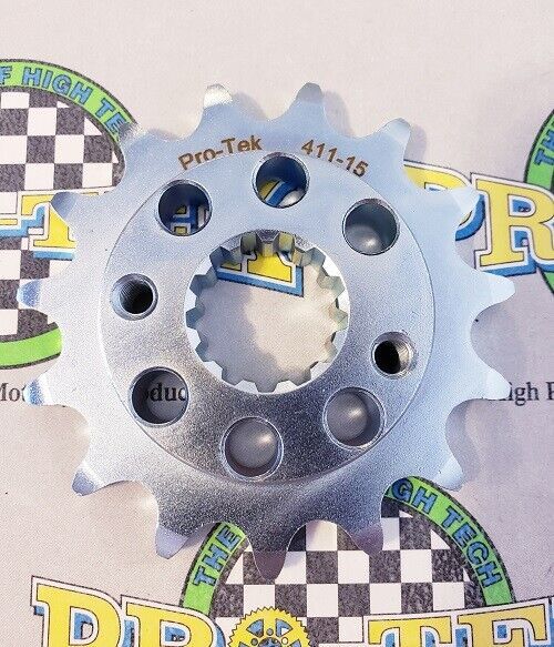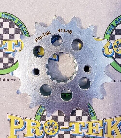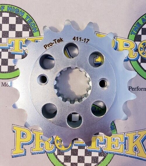 Pro-tek front sprockets are also completely CNC machined to exact tolerances from 4140 nickel-chromoly steel resulting in a quality product. None of the Pro-tek front sprockets are gear hobbed, but are lightened with drilled holes to save on rotating mass. Every lb of rotating mass equates to a 4 lb weight reduction. The sprockets are then case hardened to Rc 58-60 and finished with a zinc plating for added durability and protection from corrosion. Made in the USA, normally retail for $29.95. This is for a 525 Pitch front sprocket 15, 16 or 17 tooth.