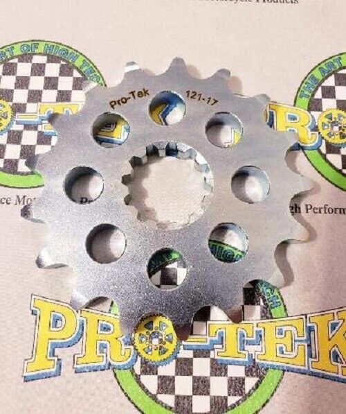 Pro-tek front sprockets are completely CNC machined to exact tolerances from 4140 nickel-chromoly steel resulting in a quality product. None of the Pro-tek front sprockets are gear hobbed, but are lightened with drilled holes to save on rotating mass. Every lb of rotating mass equates to a 4 lb weight reduction. The sprockets are then case hardened to Rc 58-60 and finished with a zinc plating for added durability and protection from corrosion. Made in the USA, normally retail for $29.95. This is for a 530 Pitch front sprocket 15, 16, 17 or 18 tooth.
