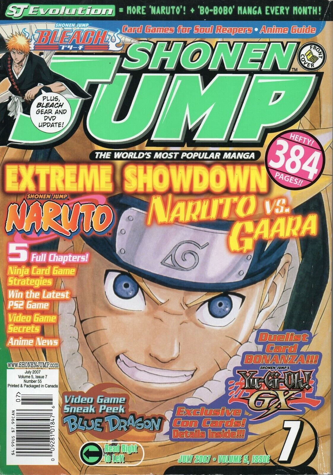 This listing is for an original copy of Shonen Jump Magazine. This is the July 2007 issue featuring Naruto, Yu Gi Oh, and Yu Yu Hakasho. The magazine is in good condition, the pages are clean and uncreased, the cover has minor shelf wear with a little water damage to the back cover. See photos.