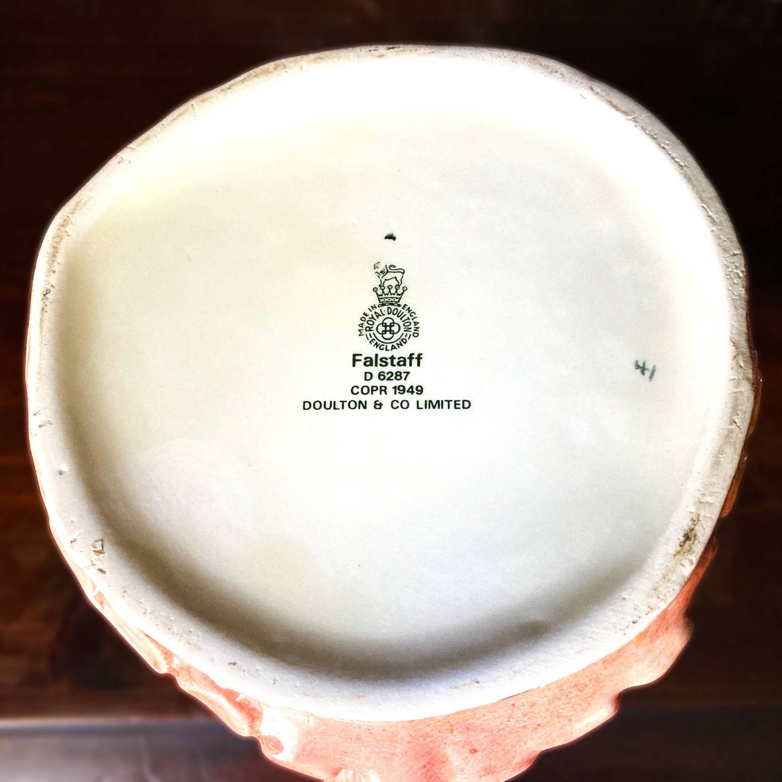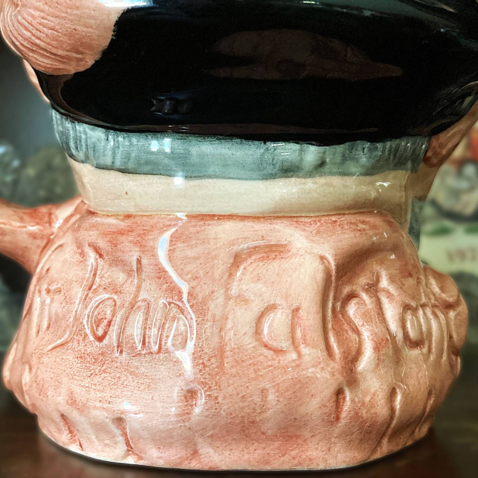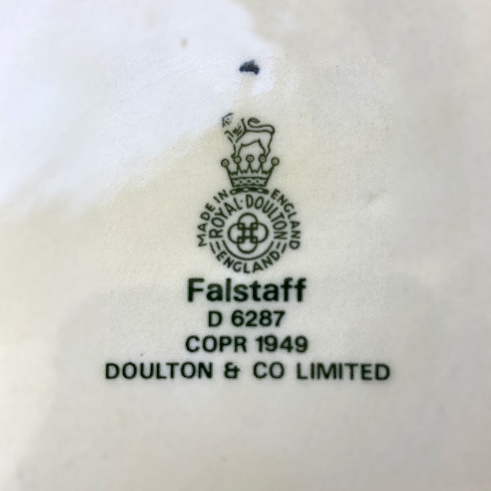 A 1970s Royal Doulton large "Falstaff" character jug. The back of the jug has John Falstaff in plain script. A Royal Doulton mark, "Falstaff", the Doulton design, or D number, 6287, copyright date, and Doulton Co Limited are on the bottom of the jug. The "Falstaff" jug was designed by Harry Fenton as part of the Characters from Literature series and was issued from 1950 - 1999. The comic character, Sir John Falstaff, appears in three Shakespeare plays and is eulogized in a fourth. The jug is 6.25" (15.87 cm) tall.