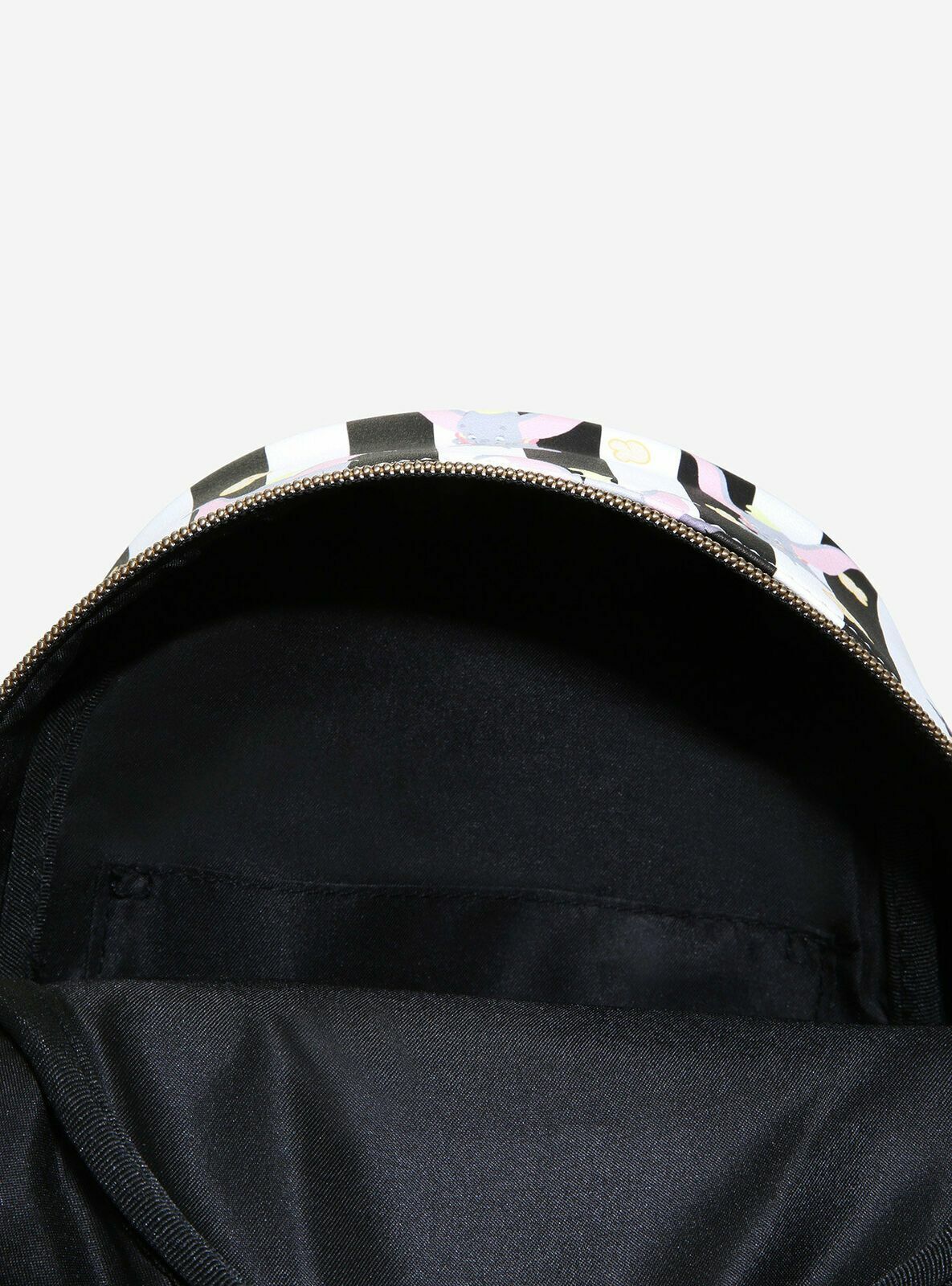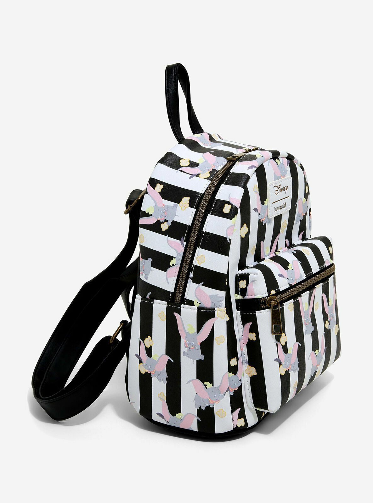Get ready for a trip to the circus with Dumbo and this mini backpack! The black and white striped background is printed all over with popcorn and Dumbo flying with his amazing ears. Featuring a front zipper pocket, adjustable straps, carrying handle, top zipper closure and internal slip pocket.