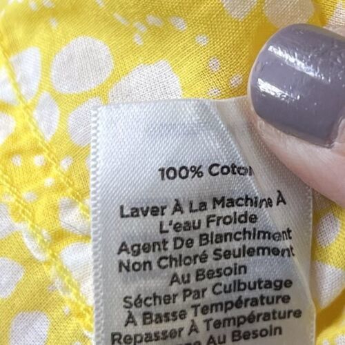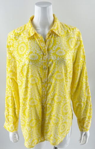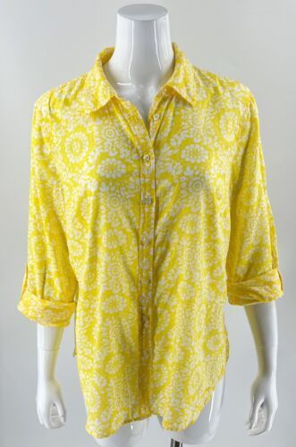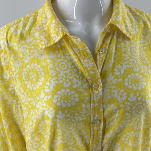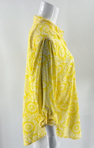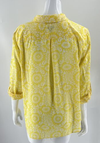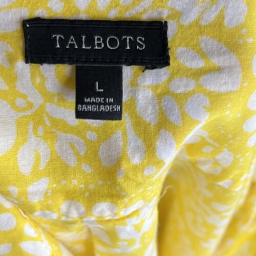 Talbots Top Size L Yellow White Printed Cotton Button Up Roll Tab Sleeve Womens