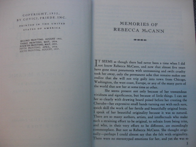 The Cheerful Cherub was an American single-panel newspaper cartoon written and drawn by Rebecca McCann. McCann began publishing Cheerful Cherub cartoons in the Chicago Evening Post in 1917, when she was just twenty years old, after editor Julian Mason took an interest in the little drawings and verses that dropped out of McCann’s portfolio as she tried to show him more serious work. Each single-panel cartoon featured the title character, accompanied by his pet dog, speaking a short verse, generally in iambic meter, offering wisdom, wit, and insight on sundry topics such as ambition, education, friendship, lies, sin, and work. The feature was soon picked up for syndication, and at its peak appeared in over 100 papers around the United States. After McCann's sudden and unexpected death, Covici Friede Publishers compiled 1,001 Cheerful Cherub cartoons and published them as Complete Cheerful Cherub in 1932. It included all of the verses and illustrations from Cheerful Cherub, Series 1 and Cheerful Cherub, Series 2 along with 404 more which had never before been published in book form. This complete compilation of McCann's work also included a short, touching memoir by McCann’s friend, Mary Graham Bonner. The book was a perennial favorite and was reprinted repeatedly from 1932 onward, first under the Covici-Friede imprint, and later on, after the companies merged, under the Crown Publishing imprint.