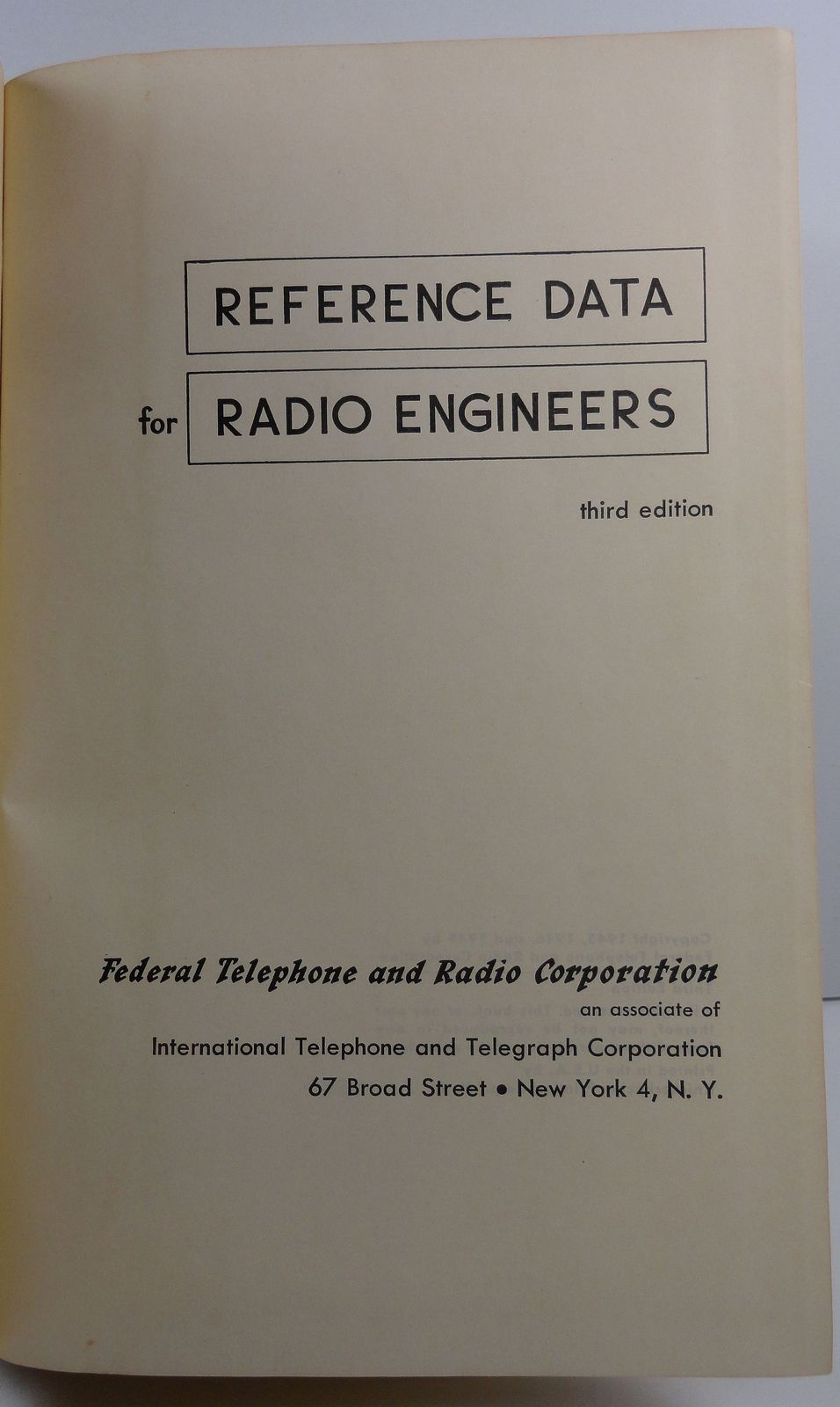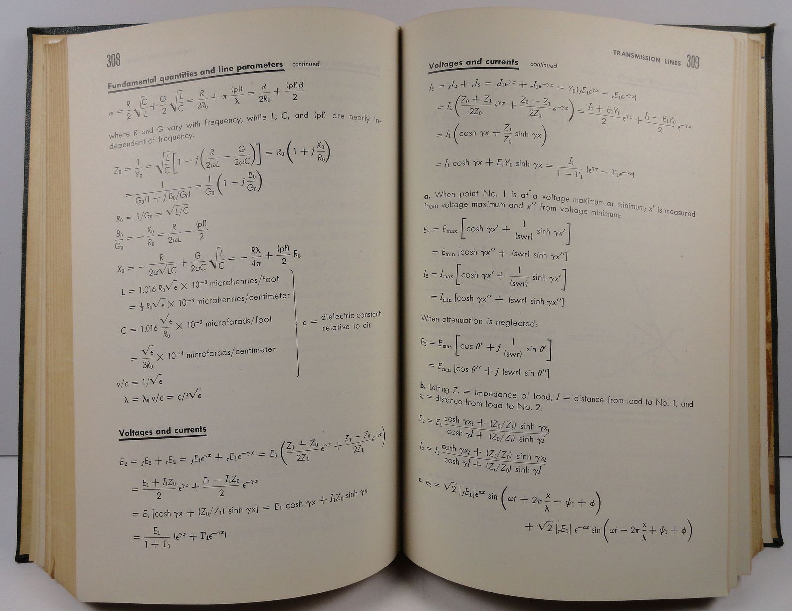 Contents: Frequency data; Units, constants, and conversion factors; Properties of materials; Components; Fundamentals of networks; Selective circuits; Filter networks; Attenuators; Bridges and impedance measurements; Rectifiers and filters; Iron-core transformers and reactors; Electron tubes; Amplifiers and oscillators; Modulation; Fourier waveform analysis; Transmission lines; Wave guides and resonators; Antennas; Radio-wave propagation; Radio noise and interference; Radar fundamentals; Broadcasting; Wire transmission; Electroacoustics; Servo mechanisms; Miscellaneous data; Maxwell's equations; Mathematical formulas; Mathematical tables (#0000538)