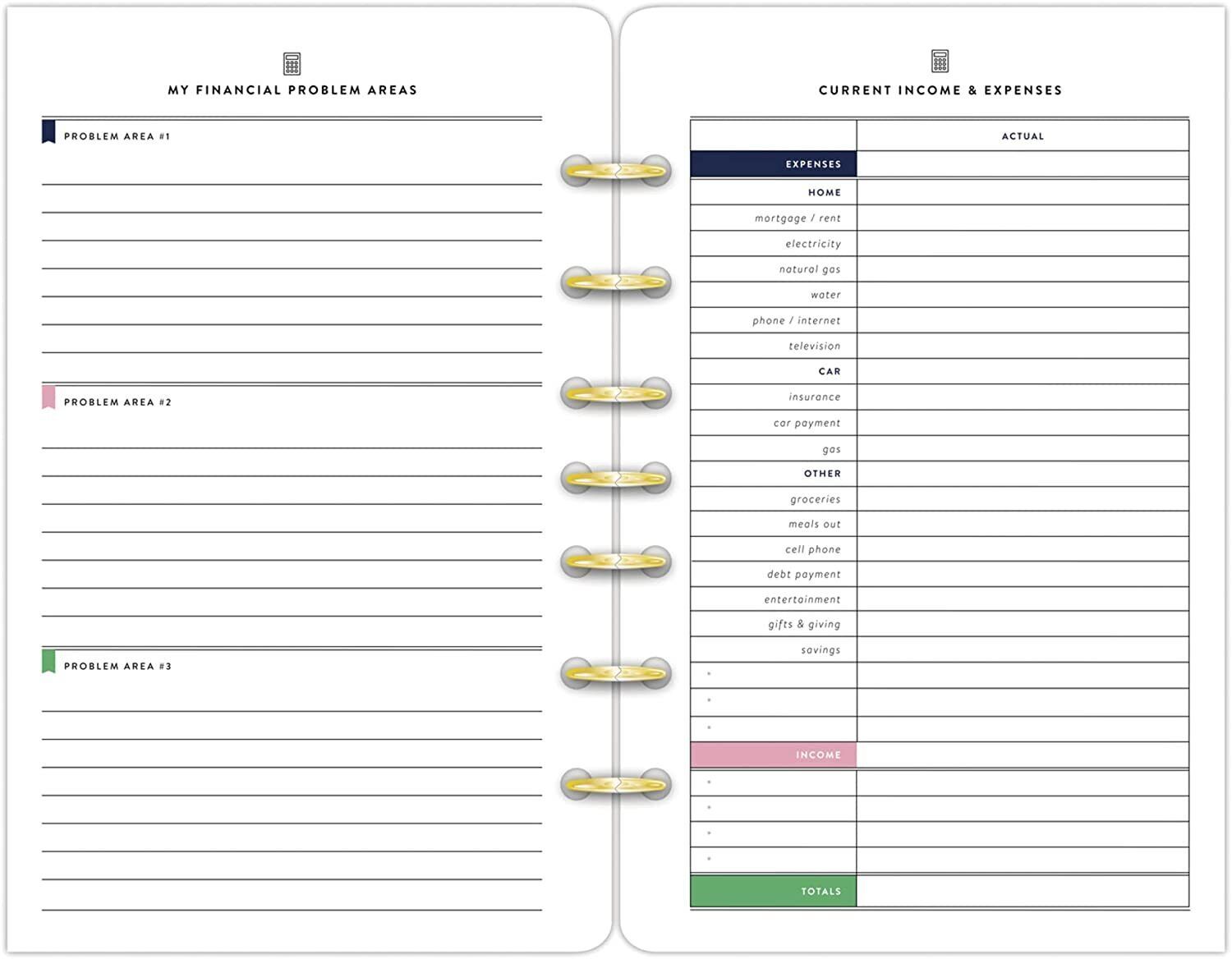 A selection of 3 different spreads to help organize your finances. Spread 1 includes pages for tracking your current income and expenses, spread 2 has space for listing your daily budget and notes and spread 3 is a project planner with a detailed note section.