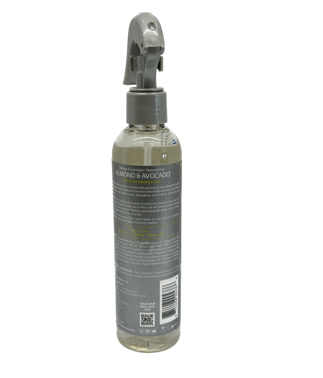 Lock in your beautiful styles with our Design Essentials Natural Almond Avocado Twist Set Setting Lotion. It's a ready-to-use setting lotion infused with panthenol and silk amino acids. This formula creates shiny, long-lasting sets and braid outs. Now, you can easily achieve styles with easy detangling, a medium hold, and styling versatility on natural hair.