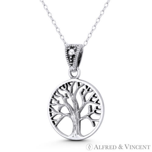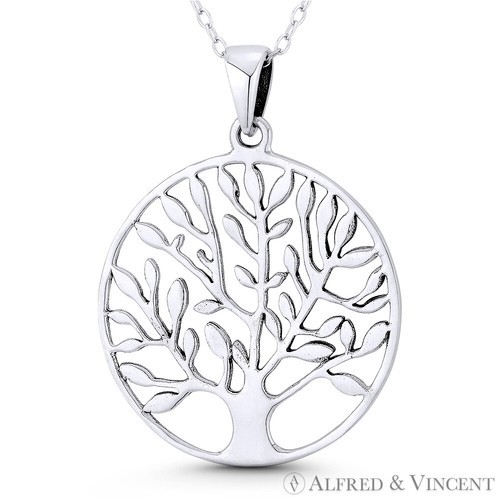 The featured pendant is cast in oxidized-finish .925 sterling silver and showcases an 18x14mm (0.7x0.6in) Tree-of-Life cutout charm finished w/ a ring-bail that will accommodate thin chains.