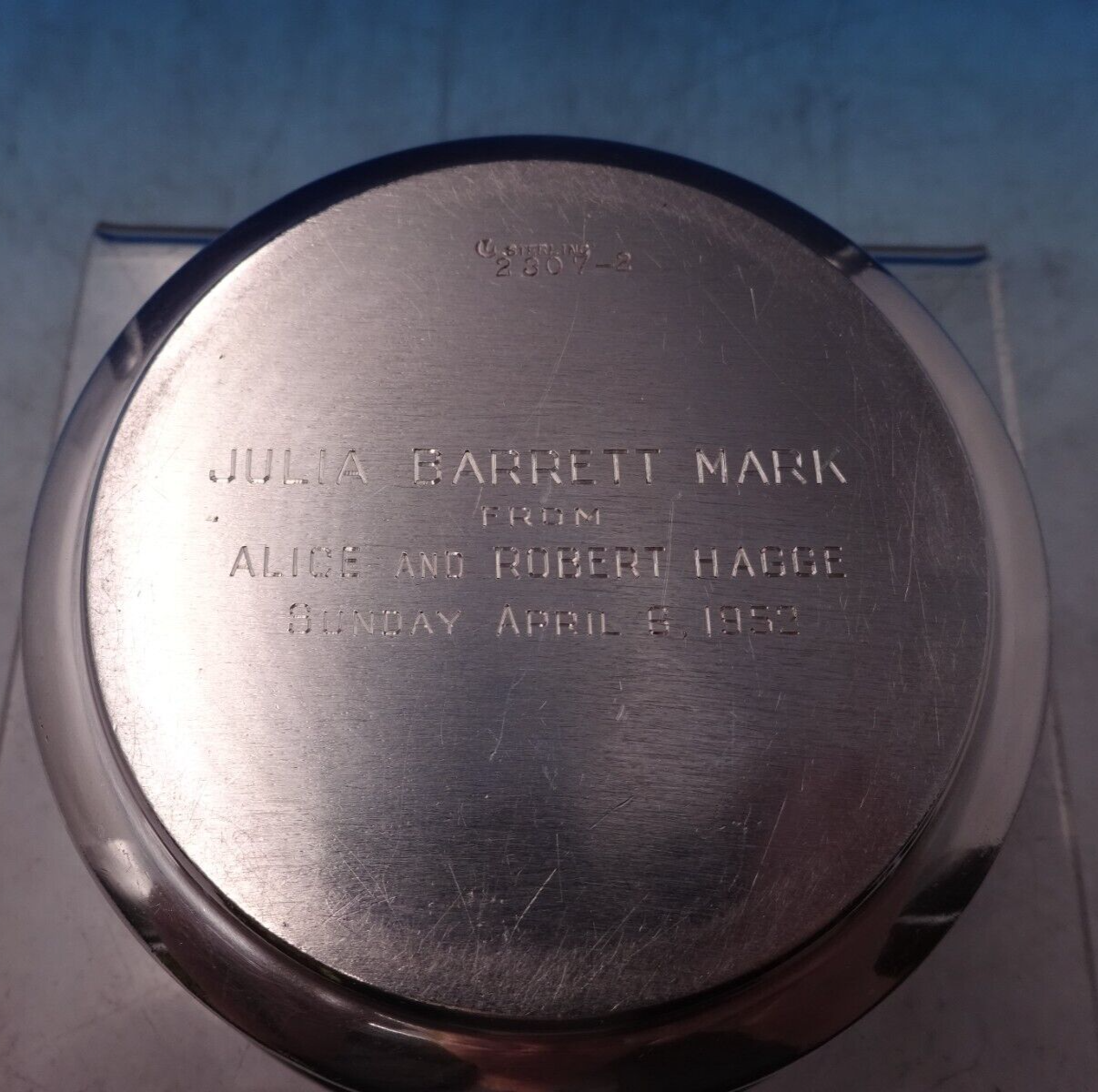 This set has an inscription on the bottom of the pieces that reads, "Julia Barrett Mark From Alice and Robert Hagge Sunday April 6, 1952" (see photos). This set is in good estate condition as shown in the photos. Delightful!