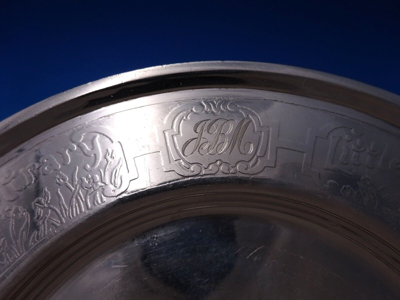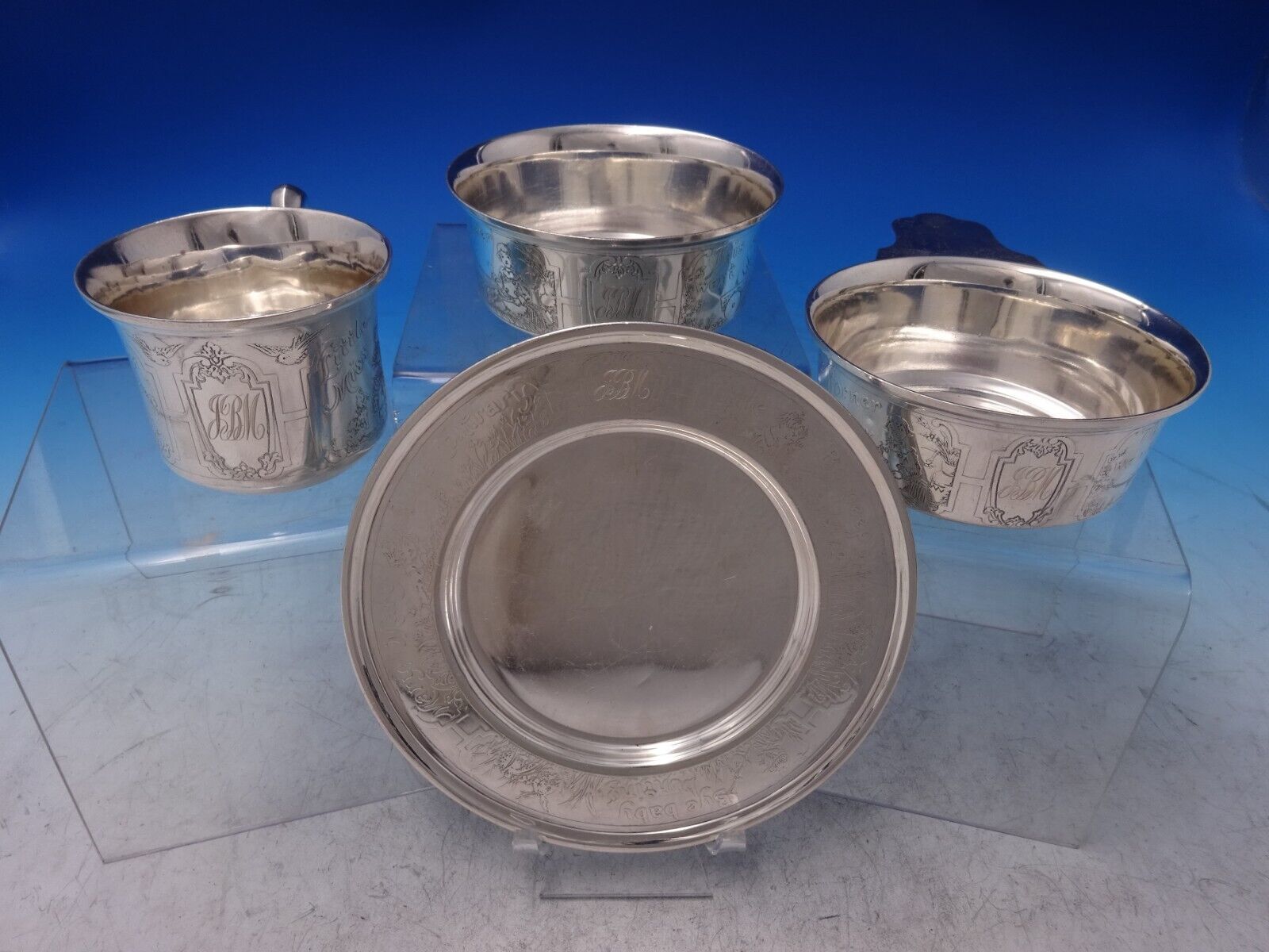 Charming Lebkuecher and Co sterling silver four-piece child's set. This set is acid etched with various nursery rhymes and includes: