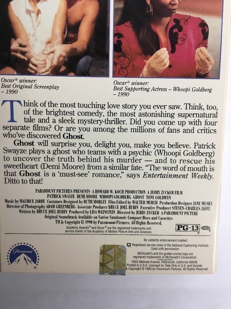 Ghost Demi Moore Patrick Swayze Whoopi 1991 VHS