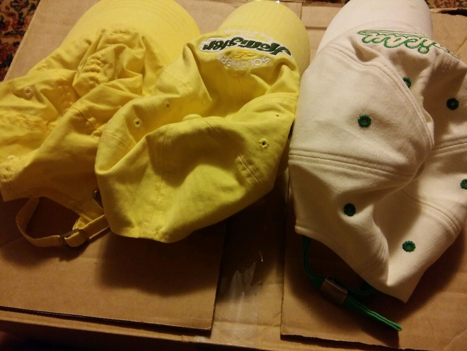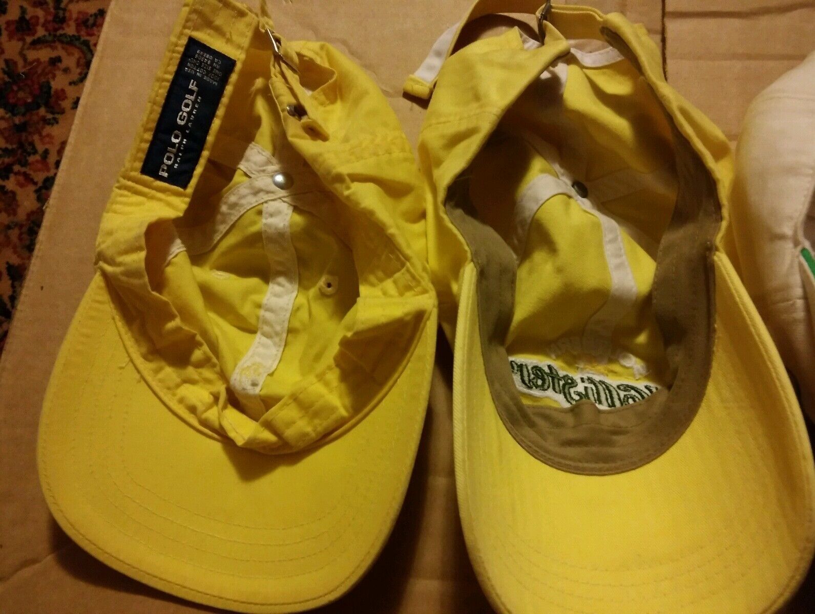 Here for bid are 3 hats. Girls/womans style. There are 2 yellow. Polo and Hollister Southern California 1922, the white is American Jeans 77. All are in good used condition. may need some minor cleaning. They adjust in the back with a metal clasp. See photos and ask any questions. thanks for bidding and good luck. Check out all my items for some great things i can combine shipping on most.