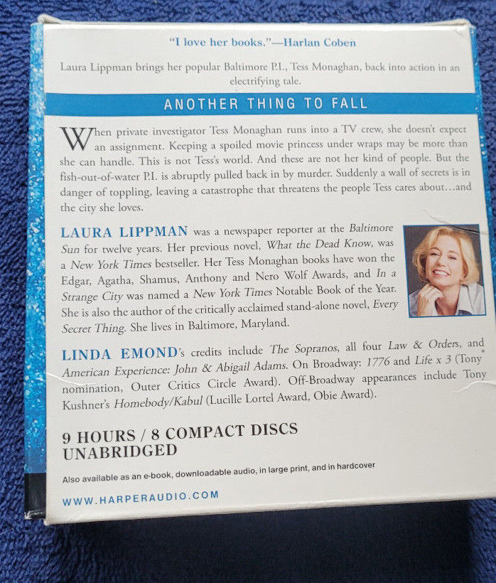 This set of 8 CD's is in good used condition. None of the CD's have been tested. It doesn't appear there are any deep scratches. Maybe a few light ones. Would make a nice addition to a travel trip. Author: Laura Lippman Title: Another Thing To Fall Read by: Linda Emond