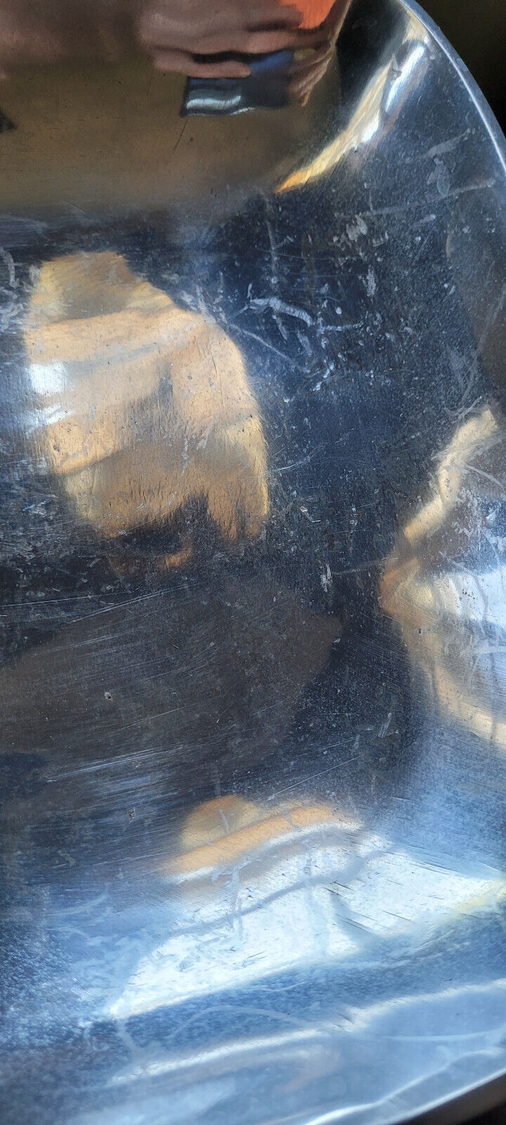 This bowl is in good used condition. There are some scratches on this bowl. Not sure if they can be buffed out or not. Even though it was made by Towle Silversmith not sure if it is even silver plated. Believe it's aluminum. Would still make a nice addition to a dinner table or collection. Could also be a nice decorative bowl.