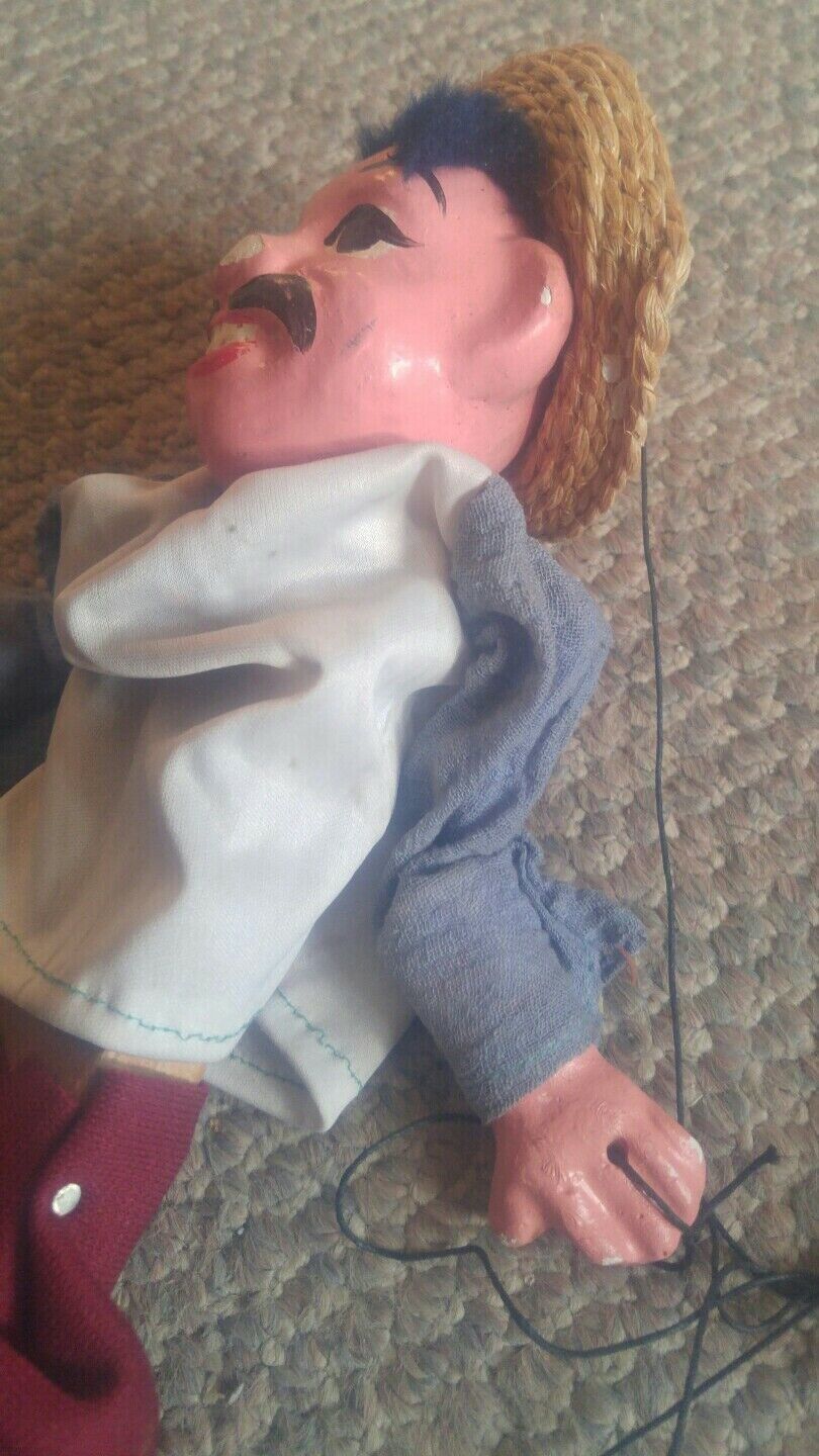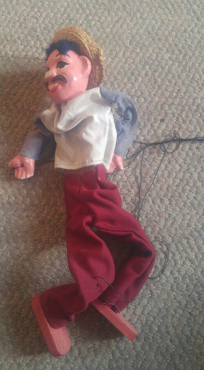 Here is a vintage Mexico made puppet. His lines are crossed and his hands and face have some wear issues. A neat little guy. Measures approx 16.5 inches from hat to feet when laid out. Selling as is. As found. Fresh from the attic.