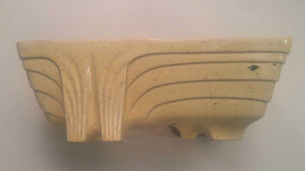 Here is a funky vintage yellow gold speckle planter. Age is unknown. Measures 10x6 inches 3.5 inches tall. No chips or cracks noticed. Some factory imperfections.