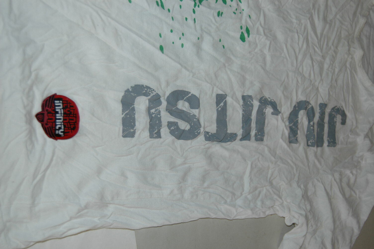 Here is a good used condition Infinity Jiu Jitsu shirt with the Brazil flag wrapped around. Has a some stain areas on the shoulder which may come out with treatment. As Is. Neat design. Measures 19 inches pit to pit.