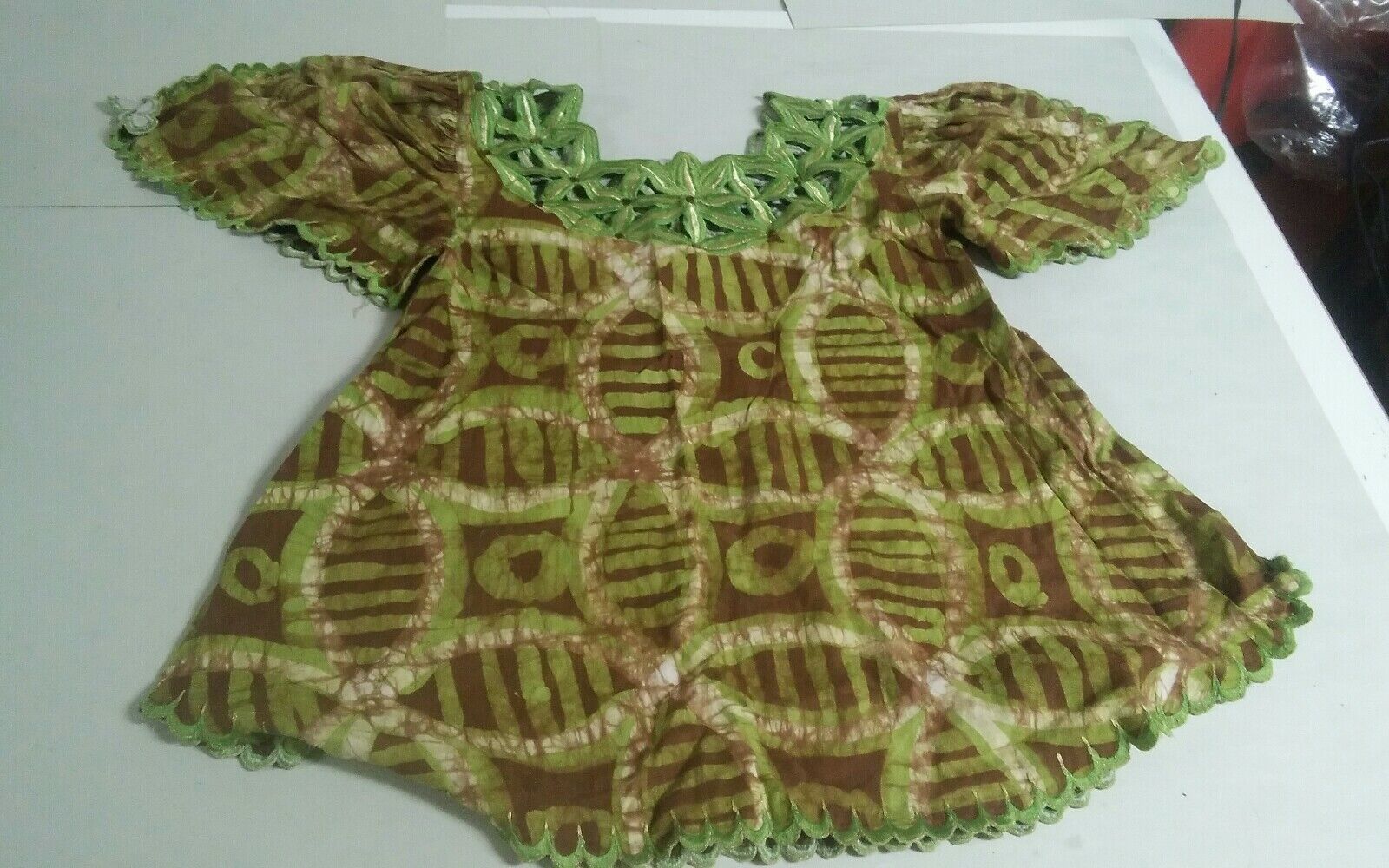 Here is a neat African style shirt. Size and maker are unknown. No tag. Measures 19 inches pit to pit. Shoulder to bottom is 28 inches.