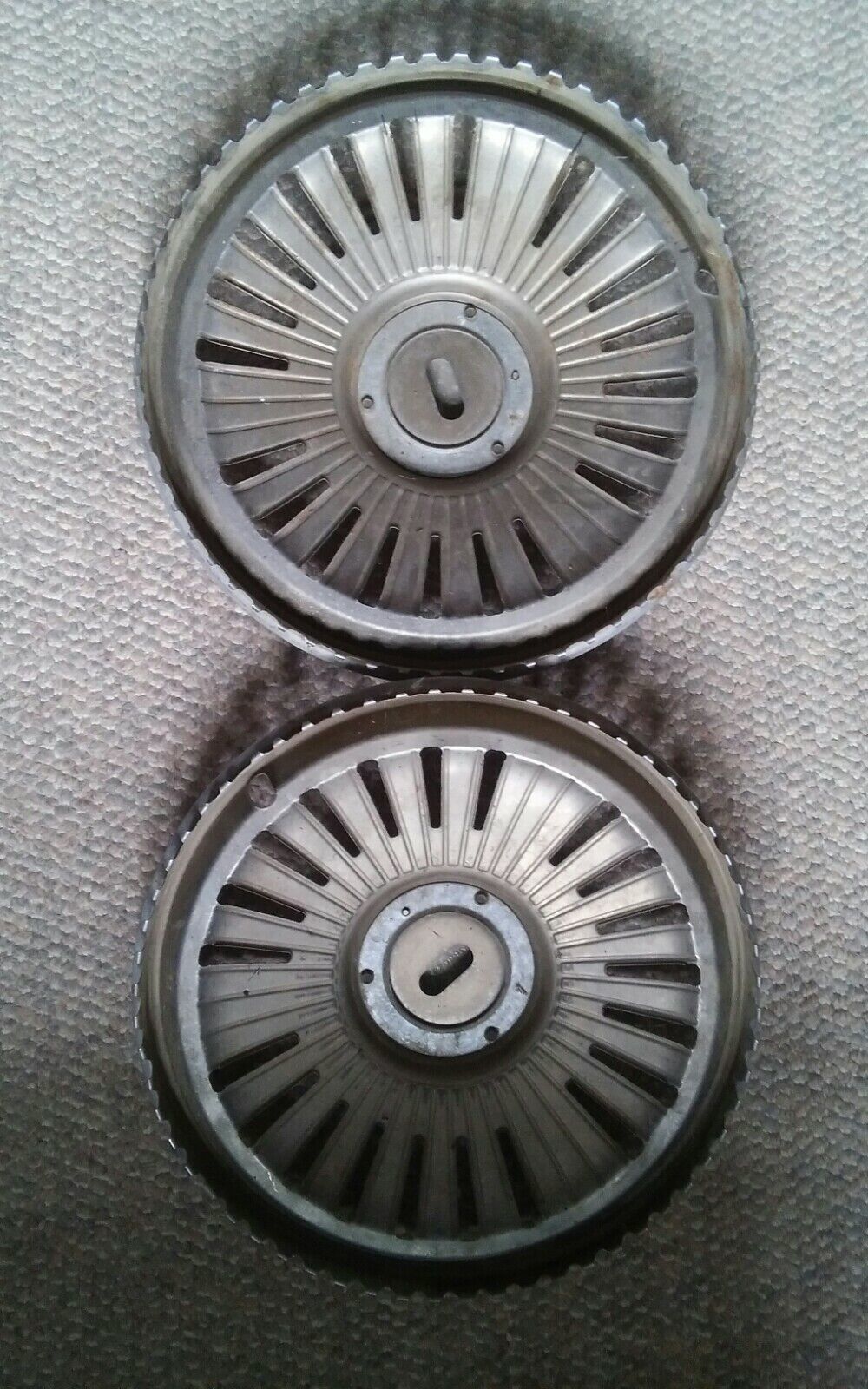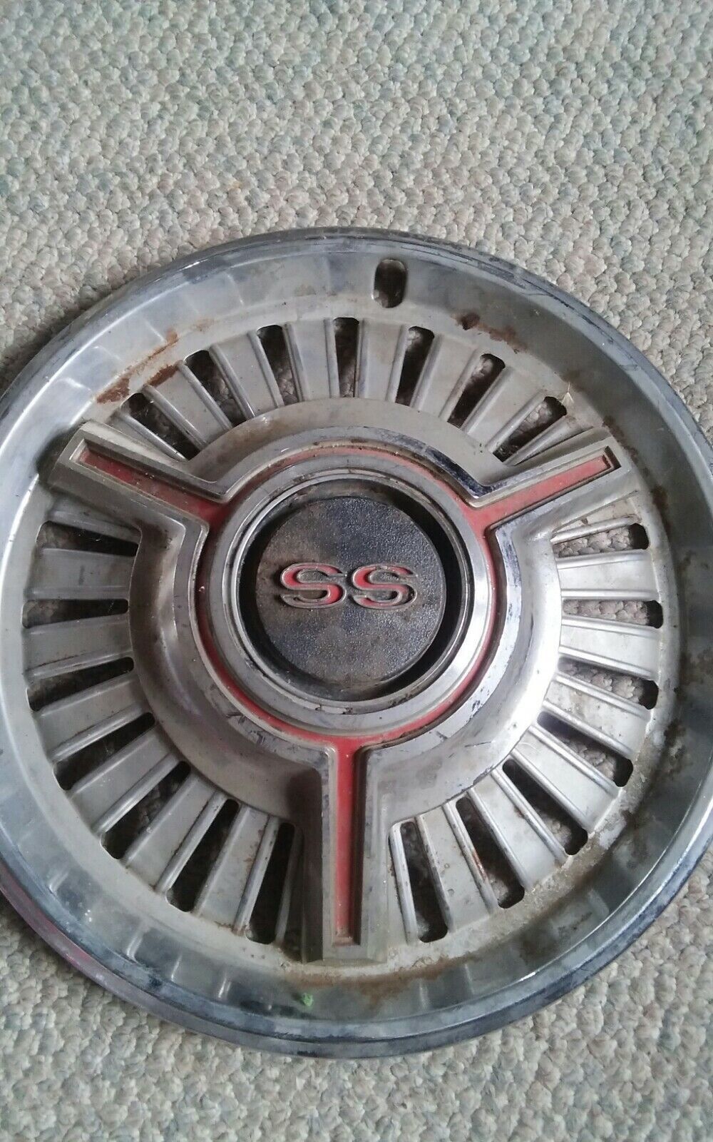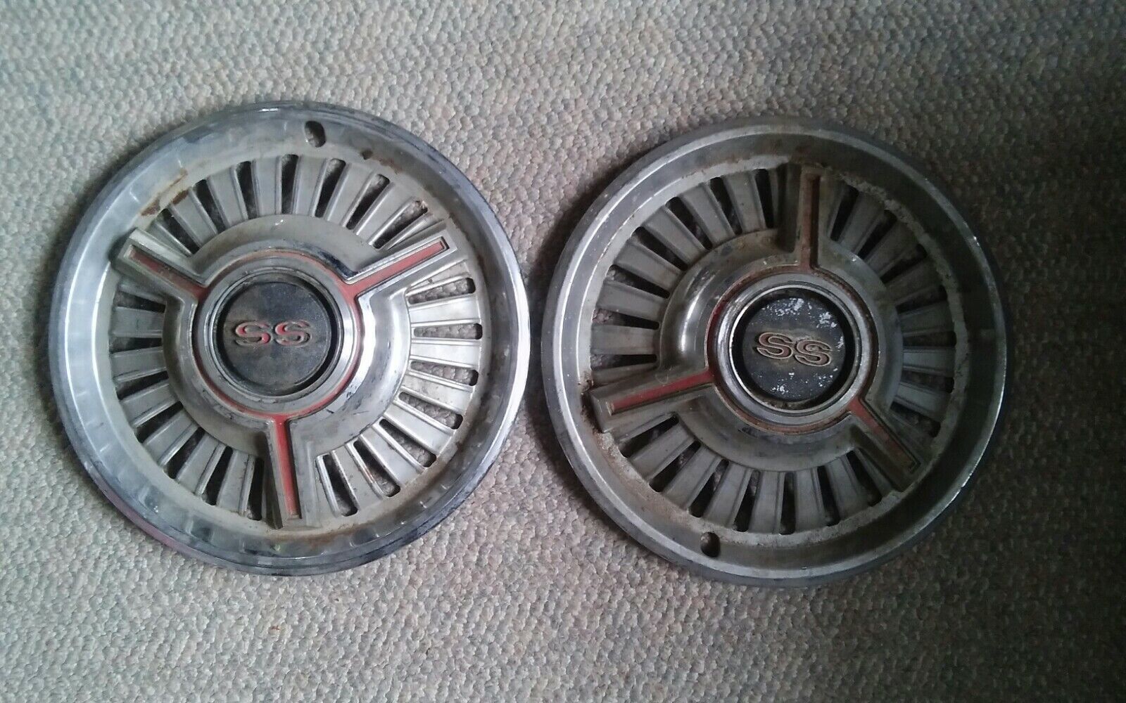 Here is a vintage pair of hubcaps. Super Sport Chevy. Not sure the year. Approx 65-67.. May have come off Chevelle, Nova, Malibu. Not positive. They have wear from age. Not a mint pair.