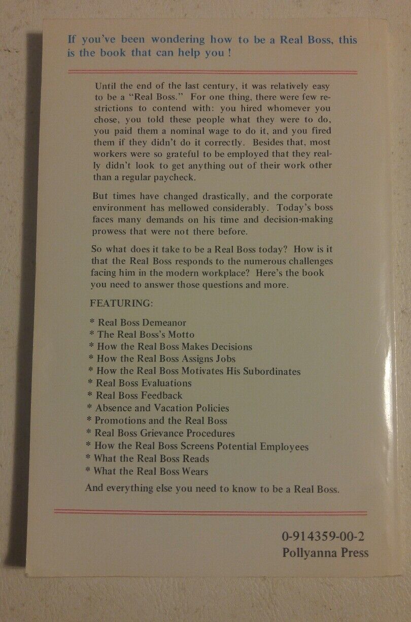 Here today is a good used condition book Real Bosses Don't Say Thank You. A Guide to being the Perfect Boss. Ellen Nevins. Minimal wear. See photos and ask any questions. I do my best to describe all items. Sometimes I miss things.. Please Please ask questions. Thanks for bidding and good luck. Check out all my items for some great finds. Lots of cool stuff at my sales. I can combine shipping on most.