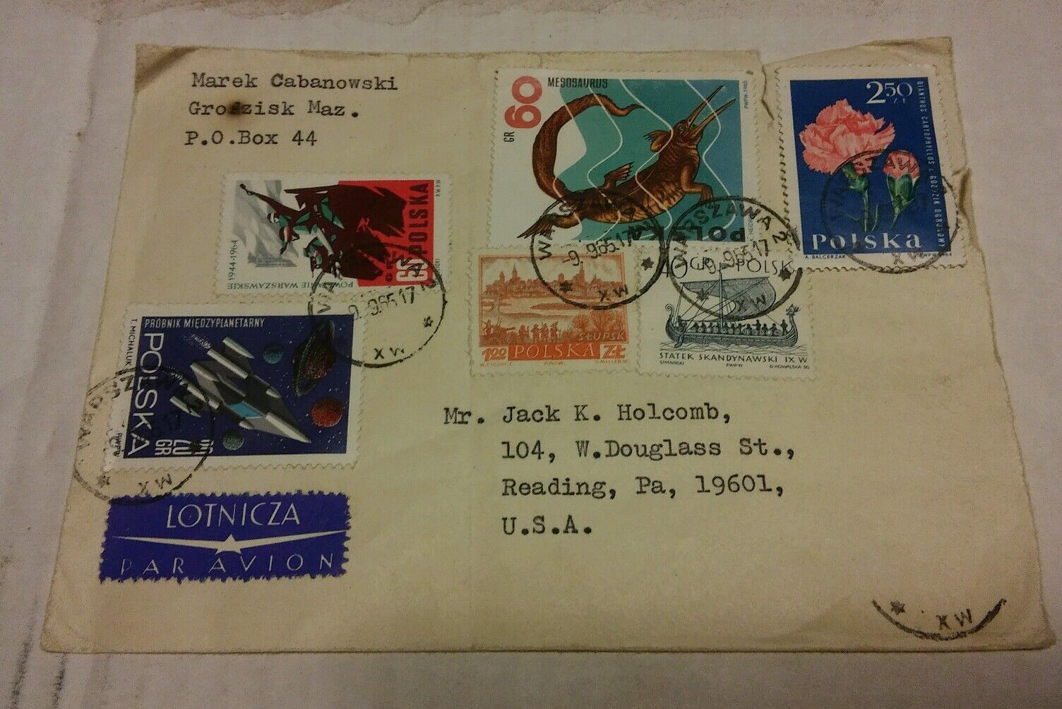 Here is a nice estate find,, an air mail envelope from Warsaw Poland with 6 stamps on it. Age is unknown, looks like 1965 but kind of hard to make out. Has wear form age. See photos and ask any questions. I do my best to describe all items. Some things I may miss or not even know about and item. Please ask questions. Thanks for bidding and good luck. Check out all my items for some great finds. Lots of cool stuff at my sales. I can combine shipping on most.
