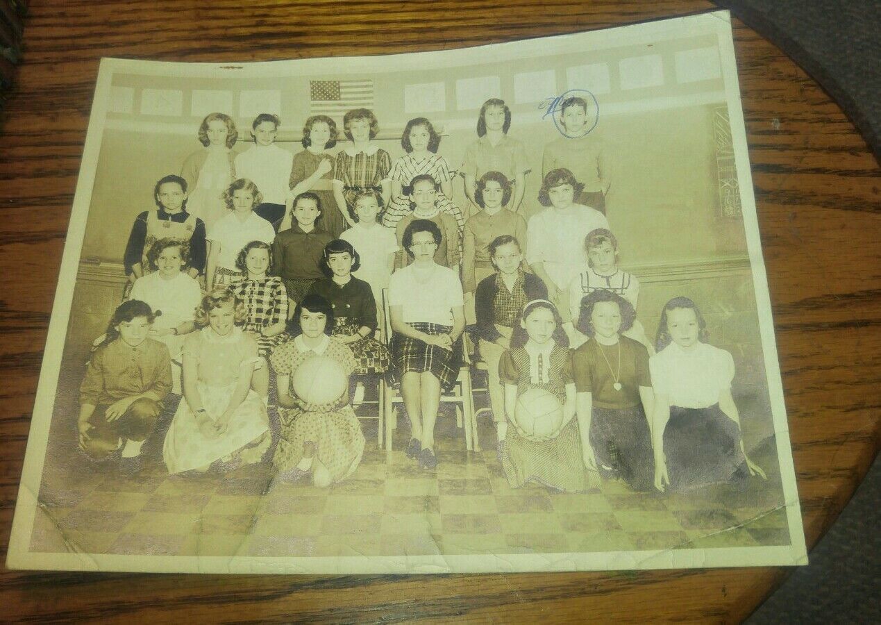 Here is a vintage photograph of well dressed girls. One is holding a volleyball. Not sure what the other ball is. Age is unknown. 1960's is the guess. Has some wear from storage.