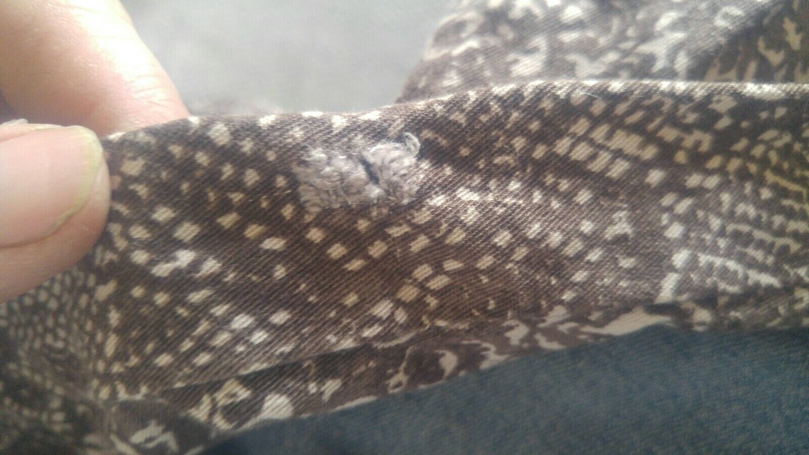 Here are a good used pair of pants. Measures 14 inches at the waist laying flat. Inseam is 28. There is a small hole starting near the inseam..few small hard to see areas if fading. Front pockets are fake.