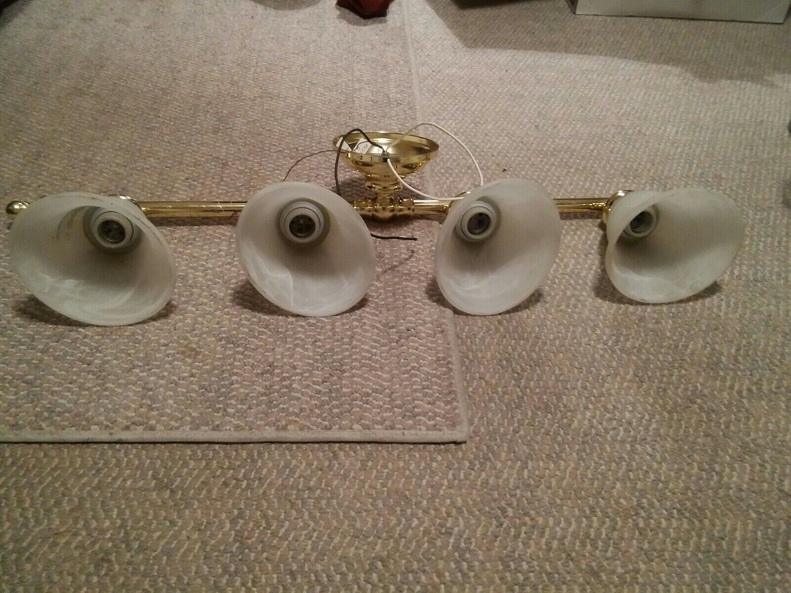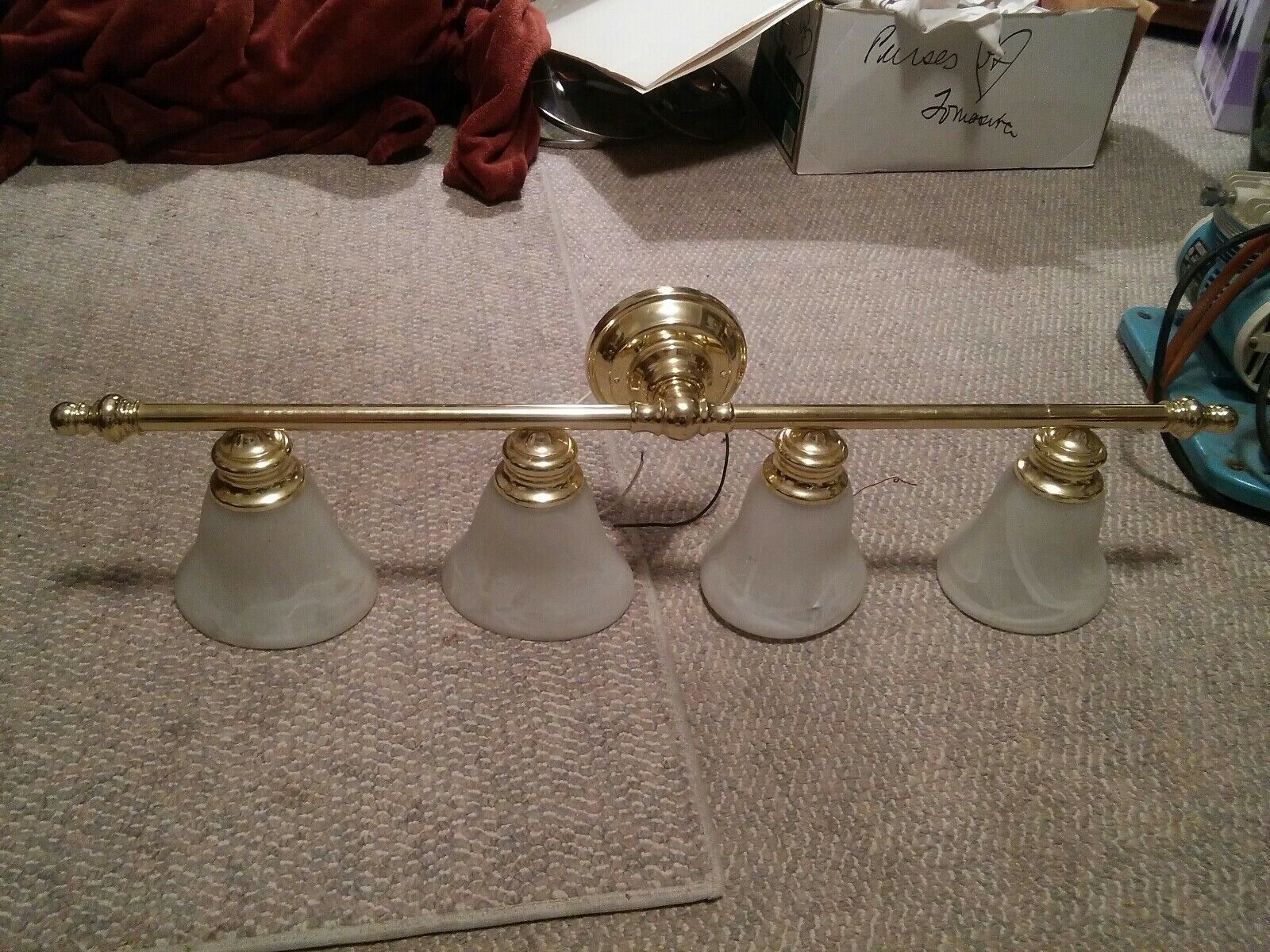 Here is a used wall mount light fixture. Vanity bathroom area. Measures 34 inches long. Has wear and scratches form use and storage. Frosted glass globes also have some marks on them. Will need to be taken apart for shipping. Local pick can be done if you choose. See photos as they are an important part of the description and will help you know what you are bidding on. I do not accept returns. I do my best to describe all items but Sometimes I miss things so the photos are important. . Please Please ask questions. Thanks for bidding and good luck. Check out all my items for some great finds. Lots of cool stuff at my sales. I can combine shipping on most.