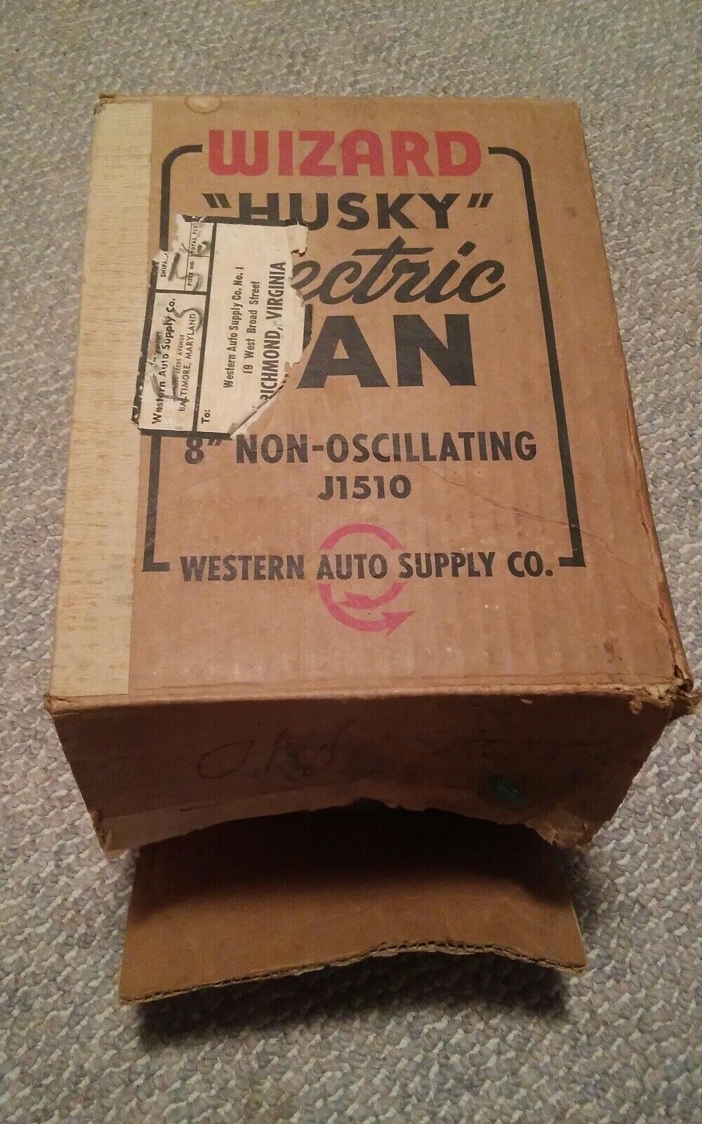 Here is a vintage Western Auto Wizard Husky Electric Fan Box only. Box has wear from age but is a neat display piece.