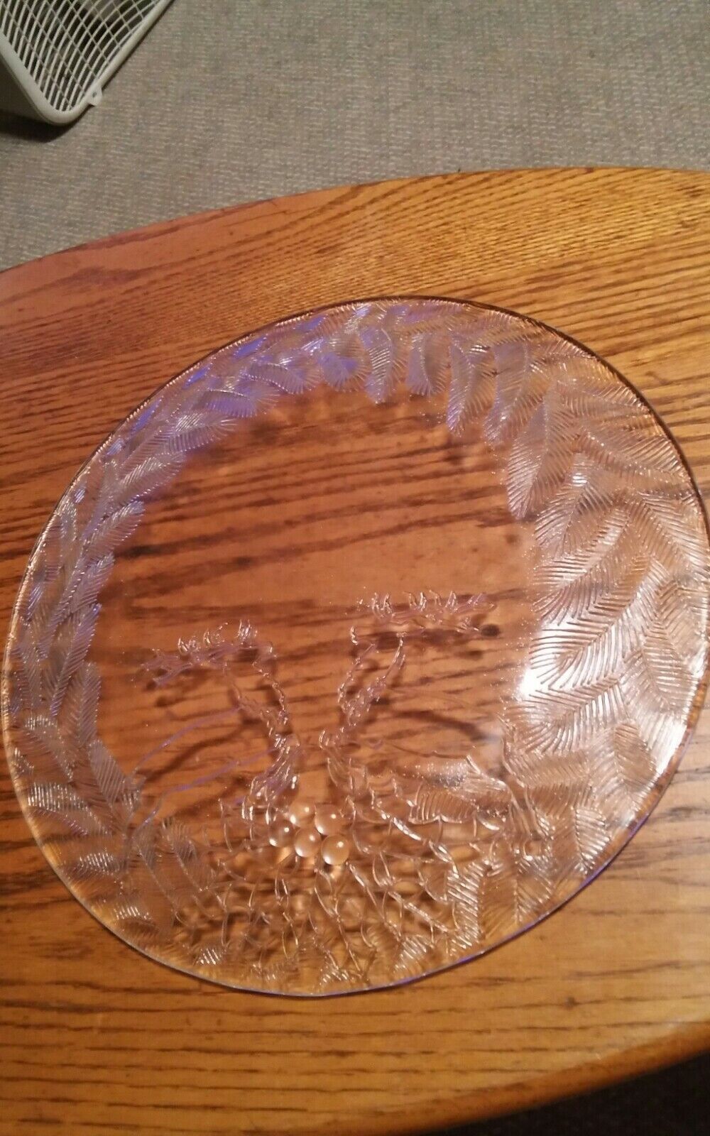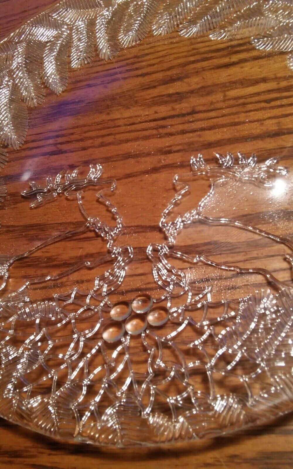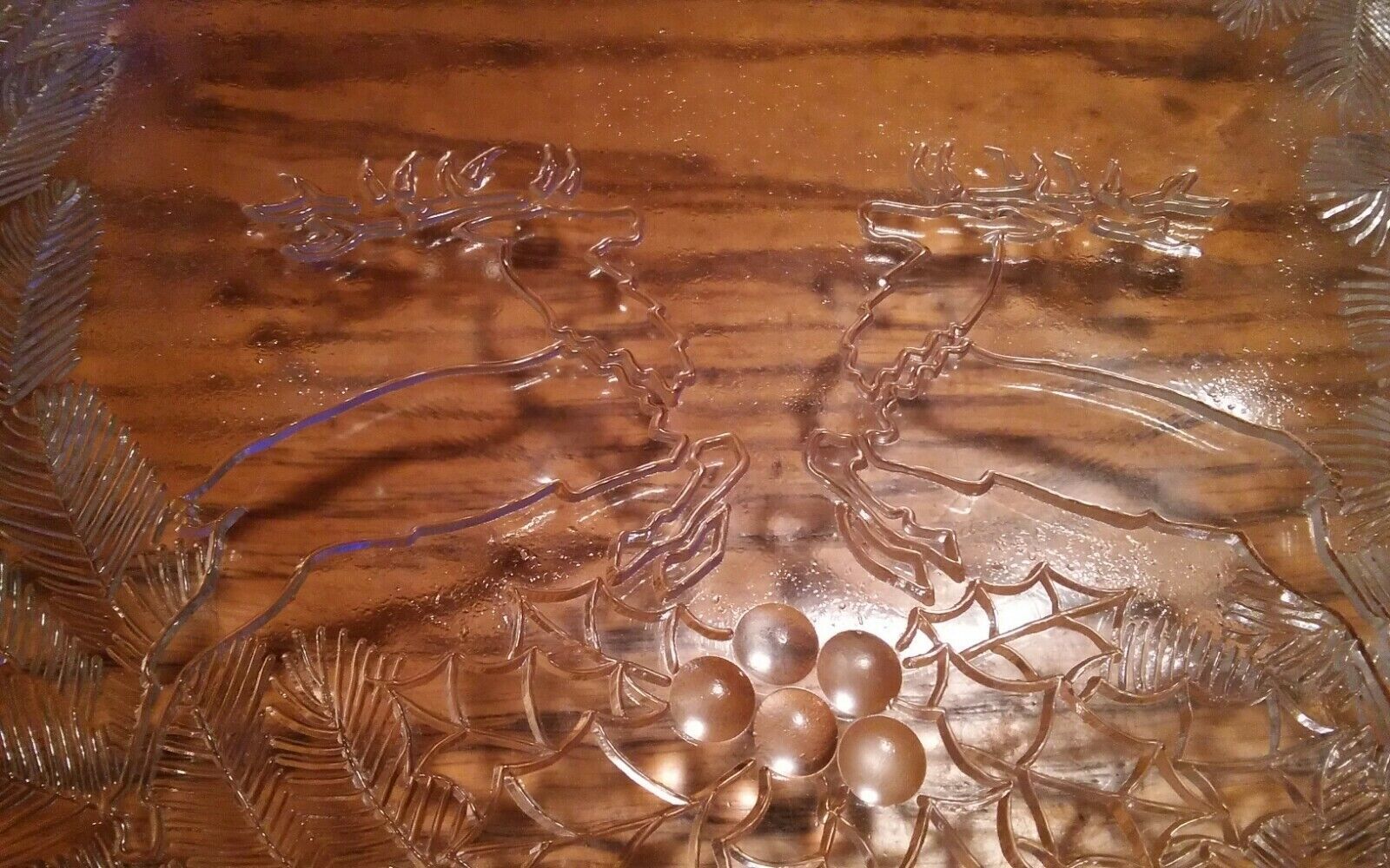 Clear Christmas Holiday Reindeer Holly Glass Plate 12.5" Embossed Pine Cookies