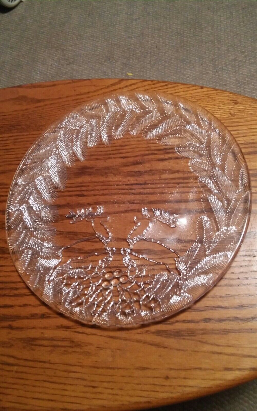 Here is a nice used condition clear glass plate. Bottom embossed with Reindeer and holly and pine branches around the sides. 12.5 inches across. Maker and age are unknown. Has some light wear.