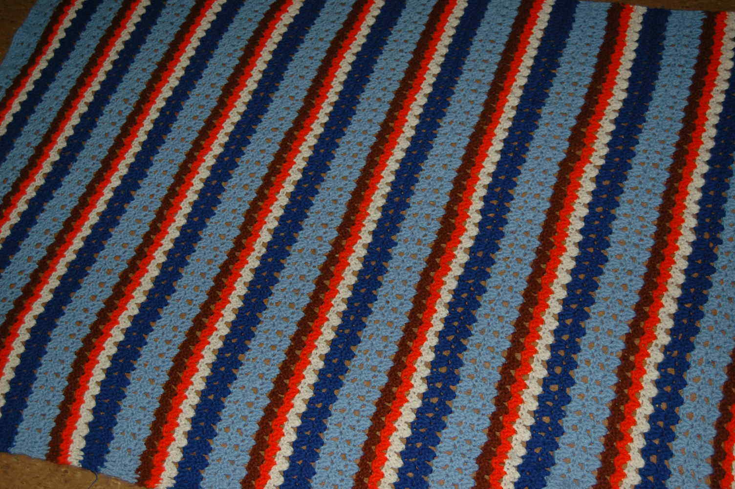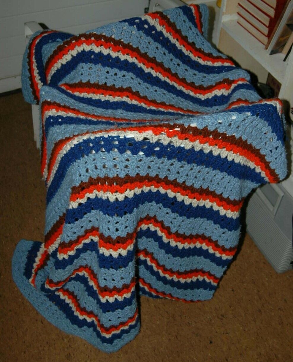 Here is a vintage throw Afghan. Looks to be handmade. Measurements are approx due to a lot of stretch. Has some light wear and a small area of soiling. Great collectible.
