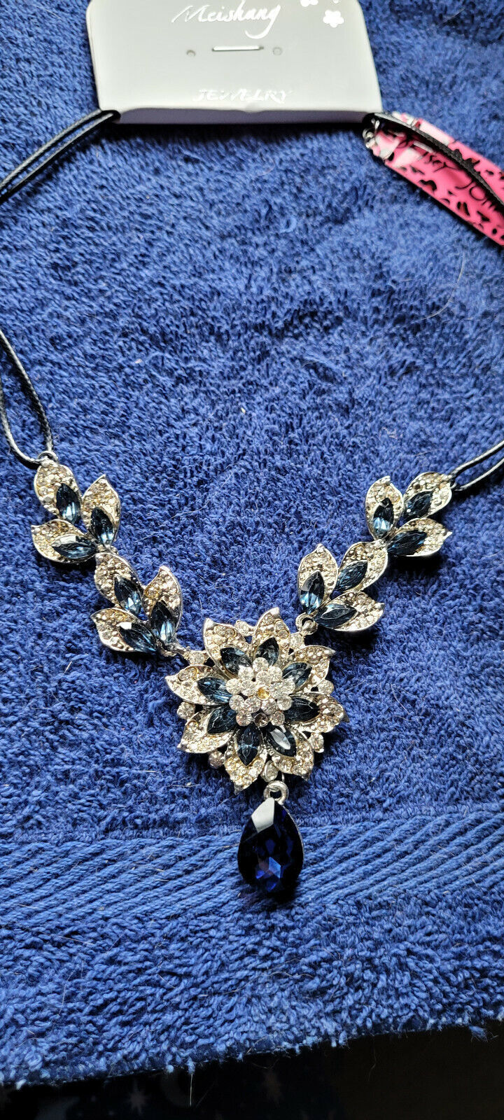 New Betsey Johnson Necklace Flowers Blueish Rhinestone Dressy Collectible Nice
