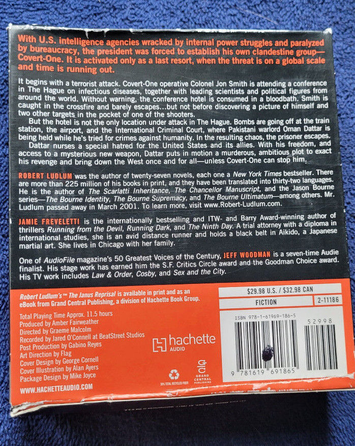 This Cd set is NIB. The box shows wear from storage. Author: Robert Ludlum Title: The Janus Reprisal Read by: Jeff Woodman. Would make a nice addition to travel.