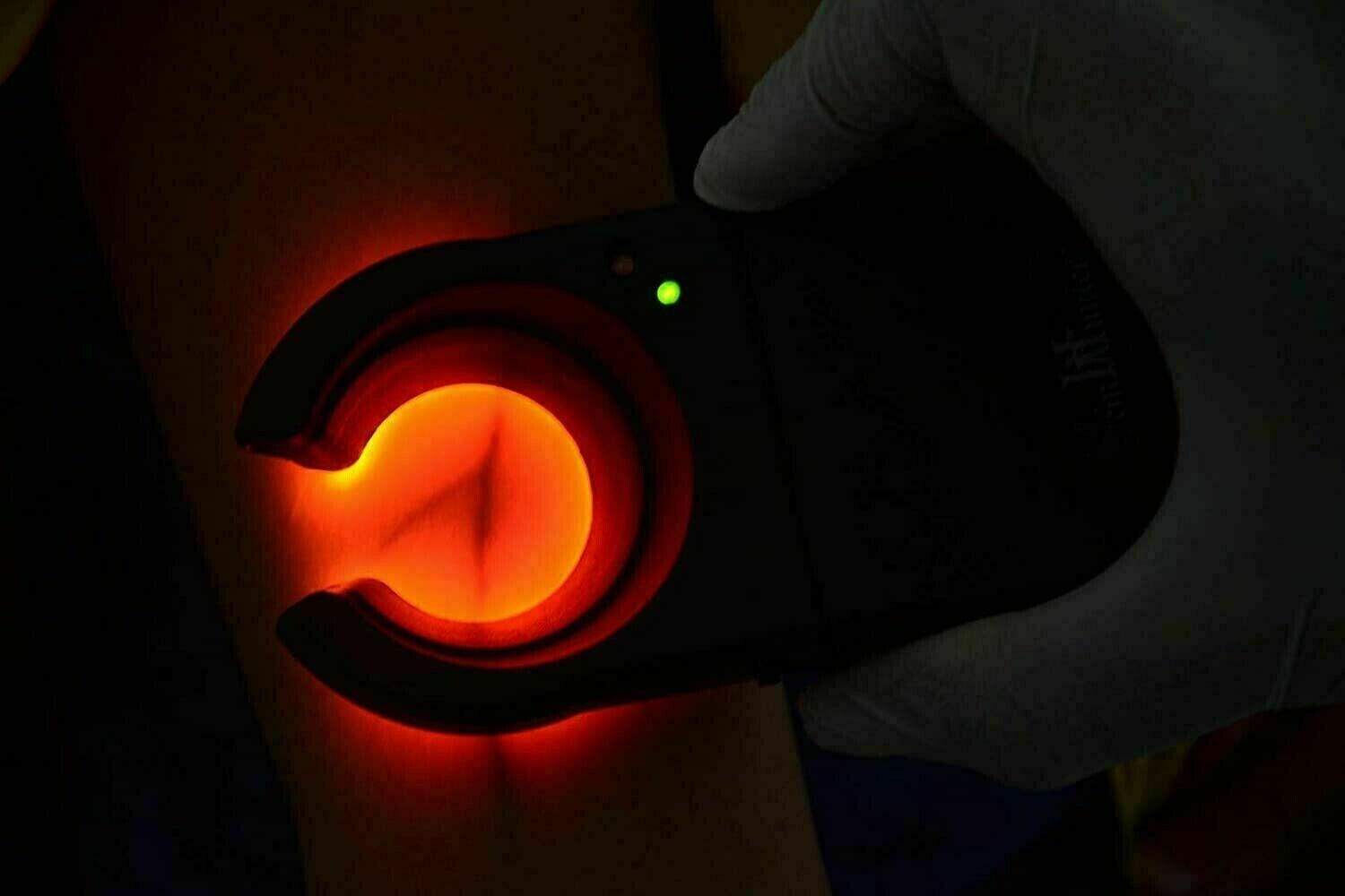 VeinHunterTM is placed on the skin, the light uniformly illuminates the