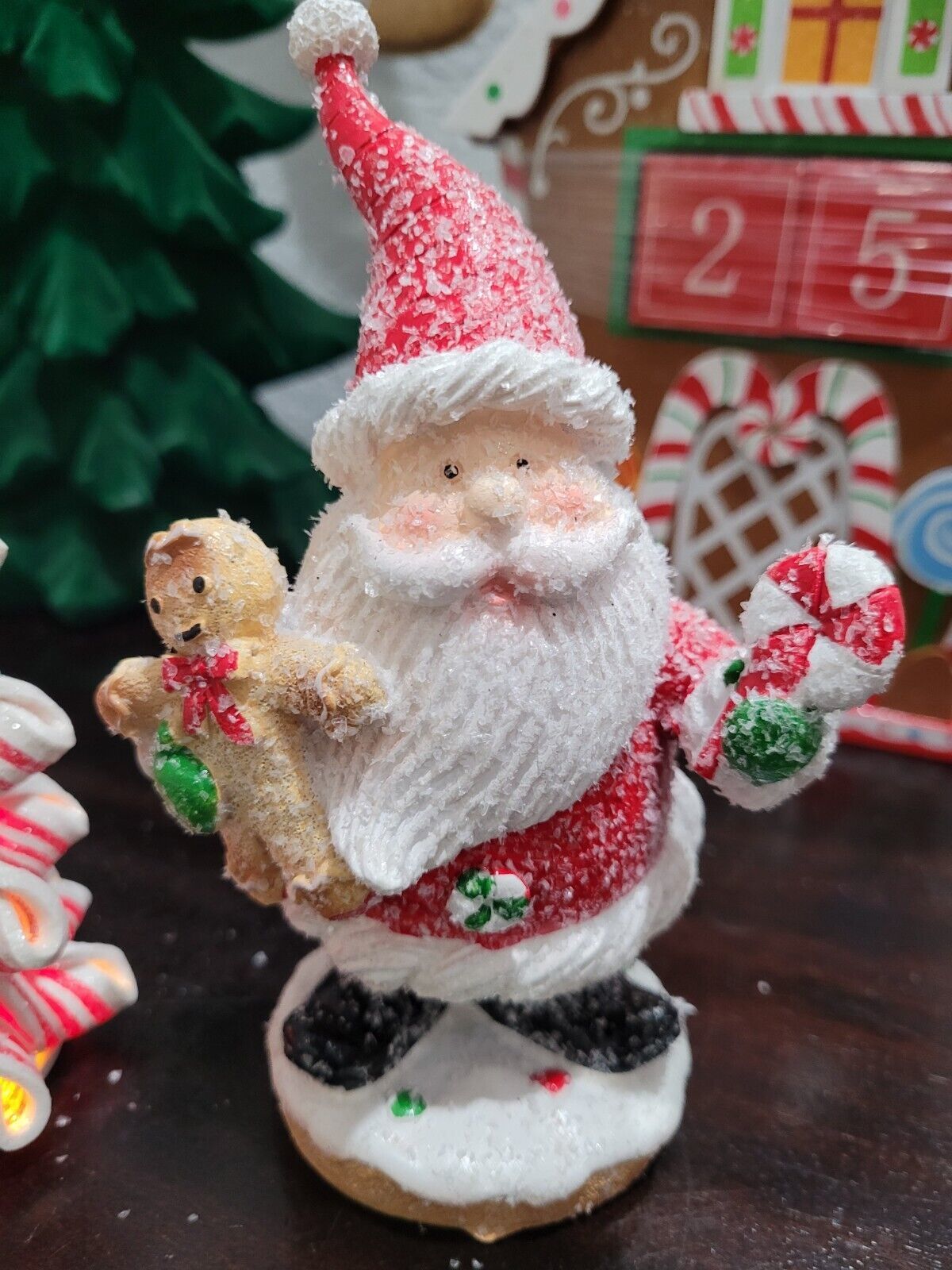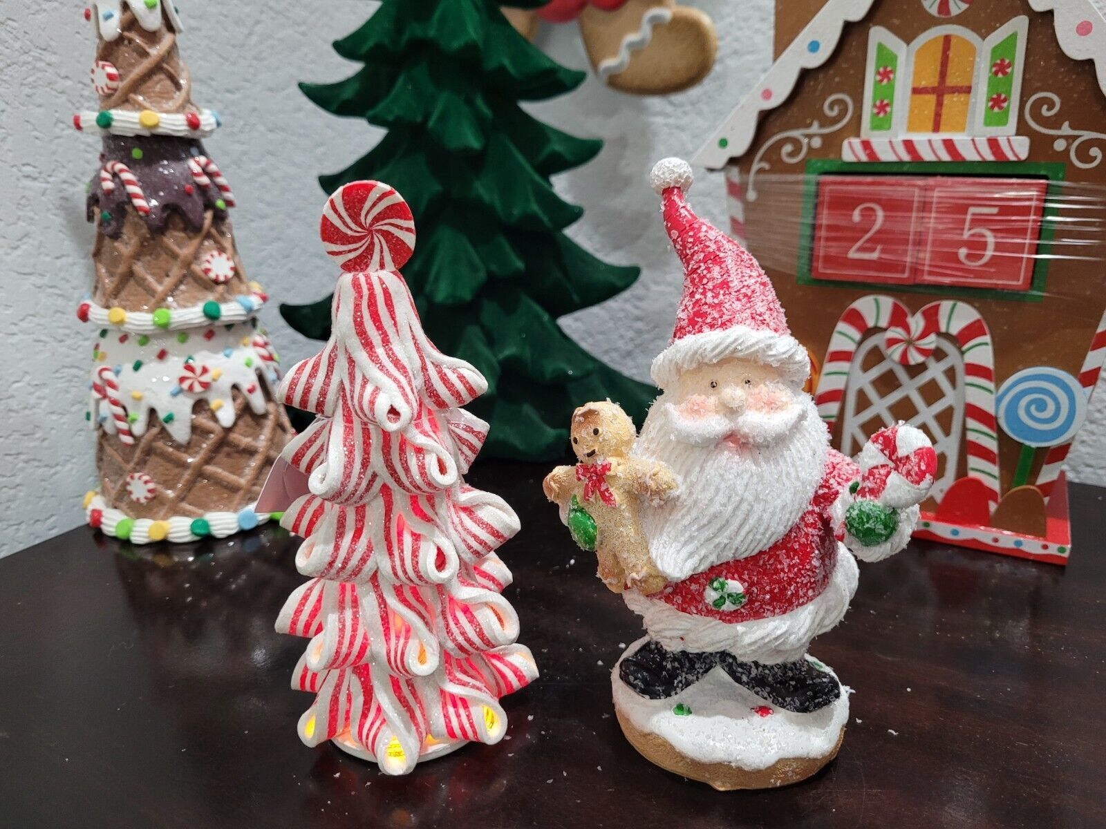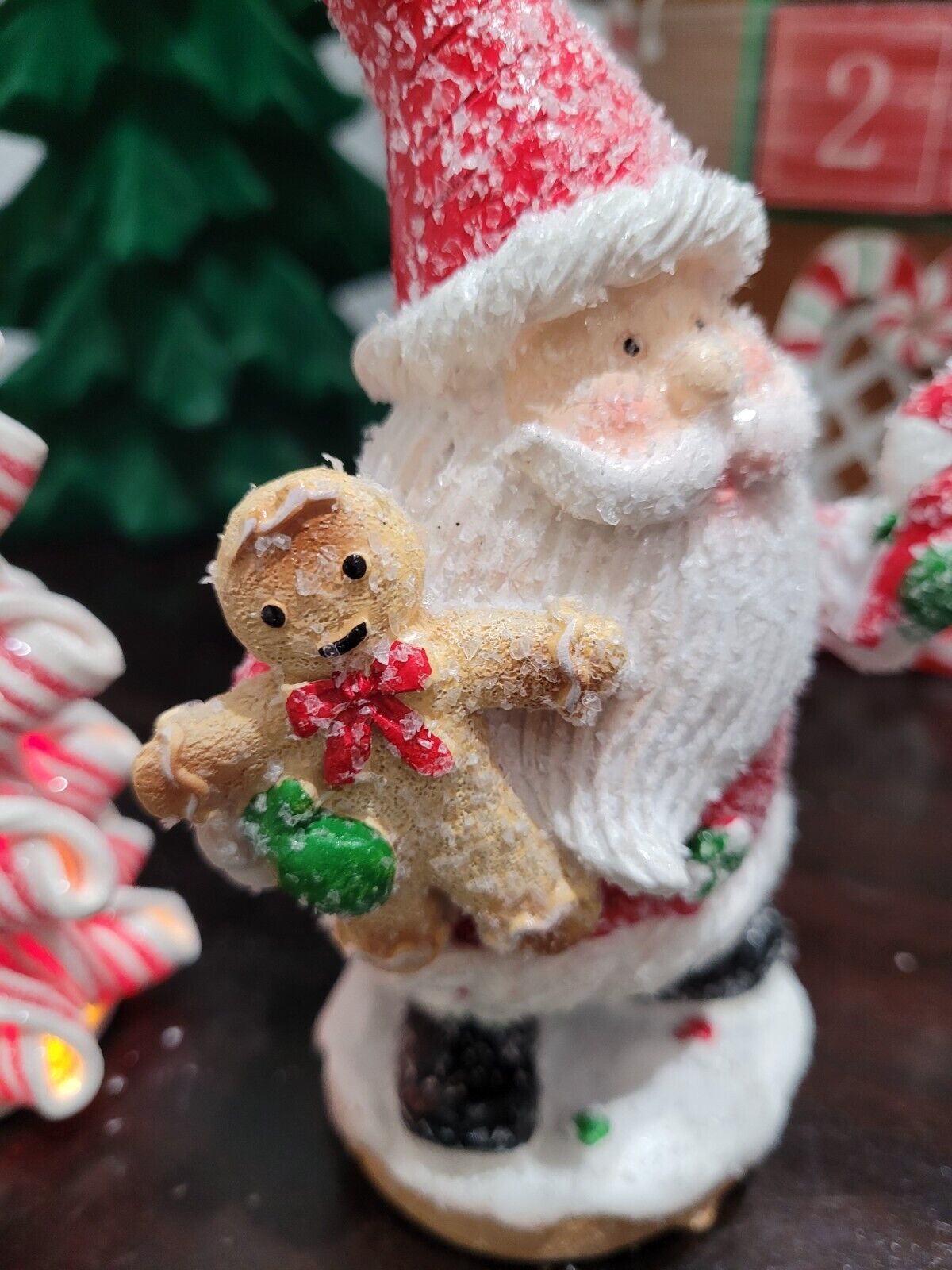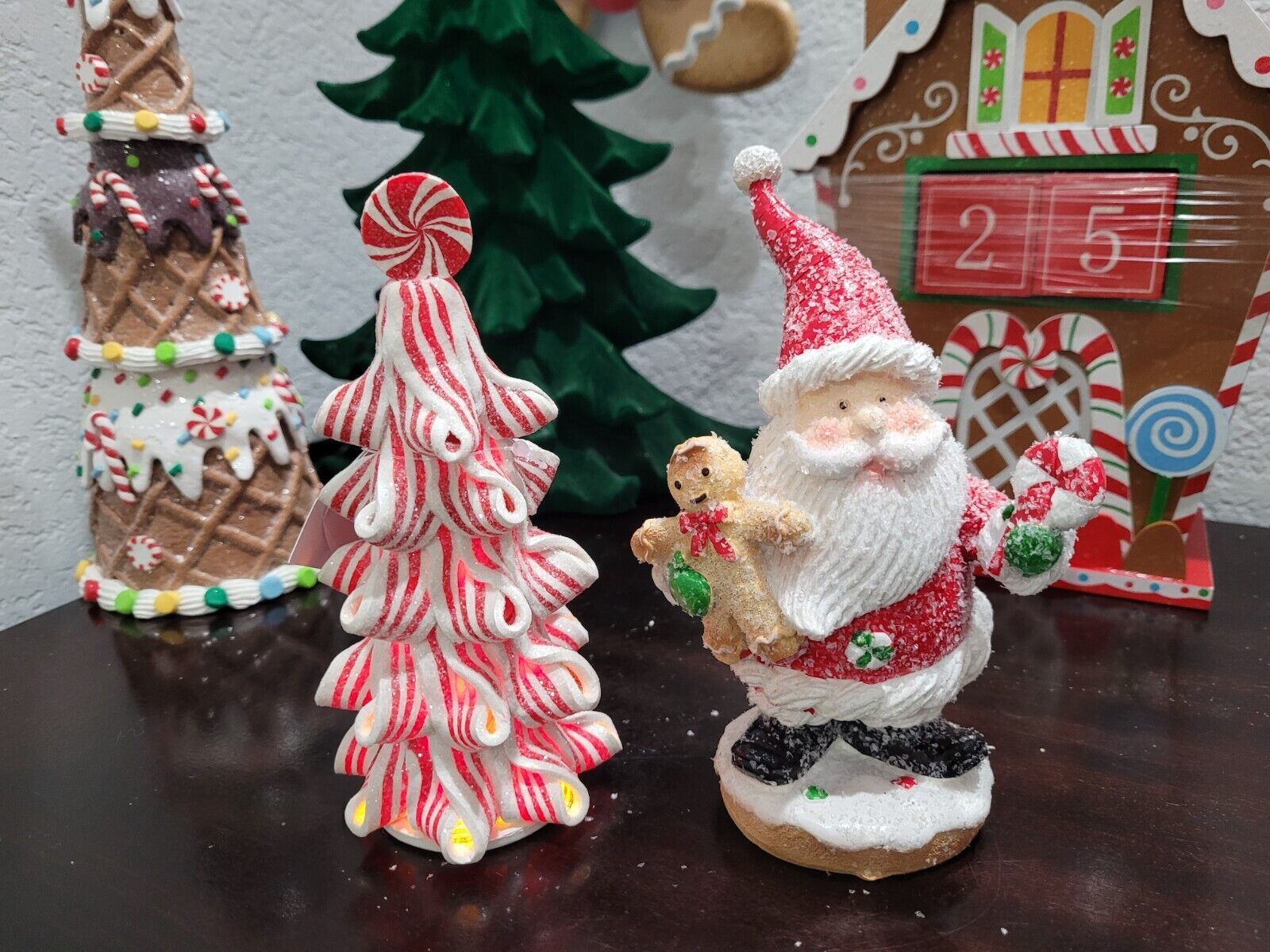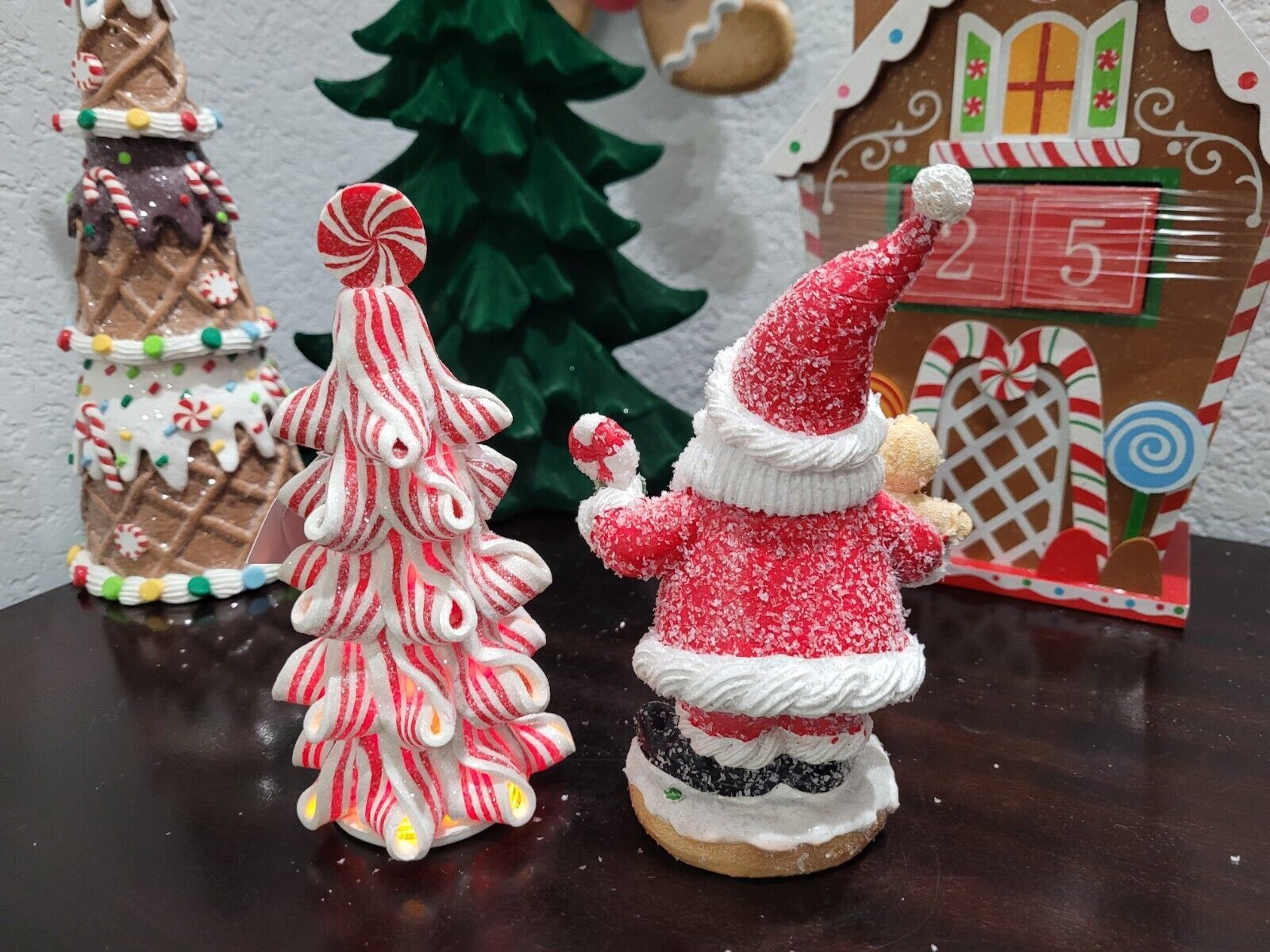 Up for sale we have this adorable 2pc holiday decor. These are sooo cute!! Included is the resin Santa Claus and the light up Peppermint tree. The Santa is made of resin and gingerbread. The light up peppermint tree looks amazing right next to Santa and that is made of some type of clay dough? Both pieces have glitter but Santa more than the tree. These are sooo cute!! Measure approx 6.5" tall. Background items are available for sale in another listings.