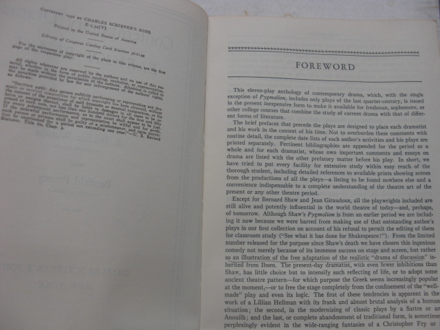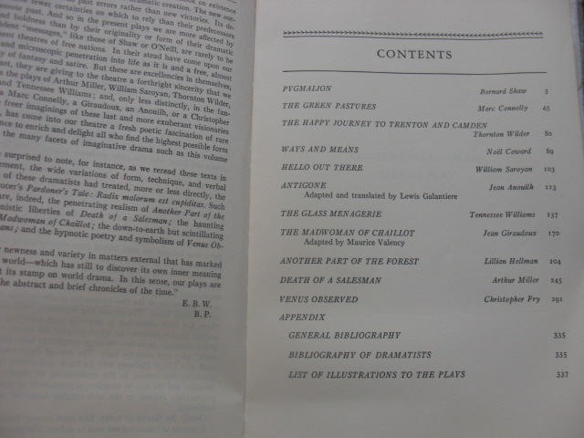 Includes: Pygmalion / Bernard The green pastures / Marc Connelly; The happy journey to Trenton and Camden / Thornton ; Ways and means / Noël Coward ; Hello out there / William Saroyan; Antigone / Jean Anouilh ; The glass menagerie / Tennessee Williams; The madwoman of Chaillot / Jean Giraudoux ; Another part of the forest / Lillian Hellman ; Death of a salesman / Arthur Miller and Venus observed / Christopher Fry.