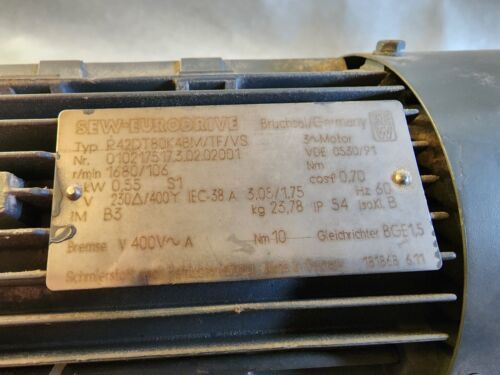Sew-Eurodrive Gear Motor Type R42DT80K4BMV/TF/VS 230/400V 1680/106 RPM .55 Kw approx. 3/4 Hp