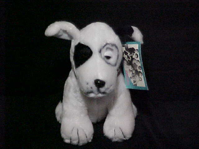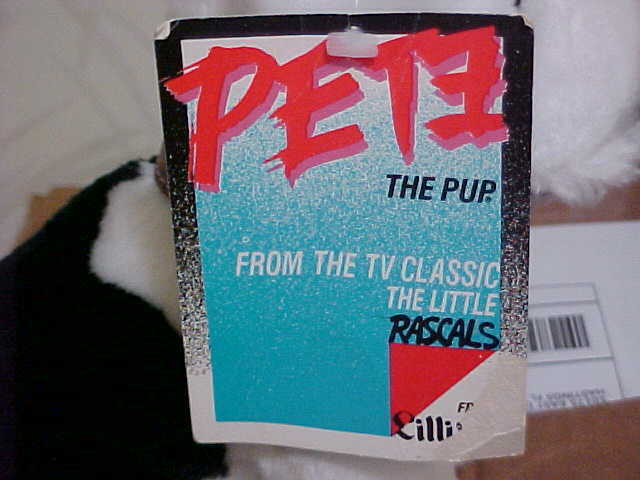 Hello everyone, Now at bottom of each of our item page is our word rating plush chart. Please check it out and read full item description before using the buy it now price. Ok here's large rare Pete The Pup Plush Toy from "The Little Rascals", which is in excellent use condition for his vintage age. Pete is white and black plush, solid black plush around right eye, black circle are left one, brown eyes, black hard shiny nose, black fabric mouth, hang tag (wear at bottom corner see pic 2), and sits a little over 8 inches tall. Tush body seam tag reads, 1986 Kings World. No rips, tears or stains.Winner bidder pays by priority mail (up to 2 lbs) with 1.50 handling fee and (.85) required delivery confirmation. Sorry we do Not Ship to Canada or Internationally. Immediate Paypal payment is required when using Buy It Now, E-Checks from Paypal are held 3-5 business days until it clears before item is ship. Since we are limited on our picture space, pic will be deleted after the end of auction, so if you would like to see pic after the auction, please print out picture before the auction ends. We due not do returns or refunds, so Please read full item description, all sales are final and are sold as worded in item description. All auction listings are offer as is condition. Please take a moment and check out our other great Disney plush and character toys which are listed sale this week. New Rating Plush Chart. NEW: Comes from a factory or department store and has not played with. MINT Or LIKE-NEW: Looks new but might still been played with but shows no wear on the Plush itself but still might have a flaw (like a odor, etc., and might not been wash even though we strive very hard to make all our plush smell free but can not guaranteed them) EX. COND: Some minor play wear and might have some minor flaws which would be in the item description. VERY GOOD: Has been played with and has flaws. GOOD: Has been played with a lot. POOR: We try not to sell any real poor condition toys. Thank-You and Have A Fantastic Week