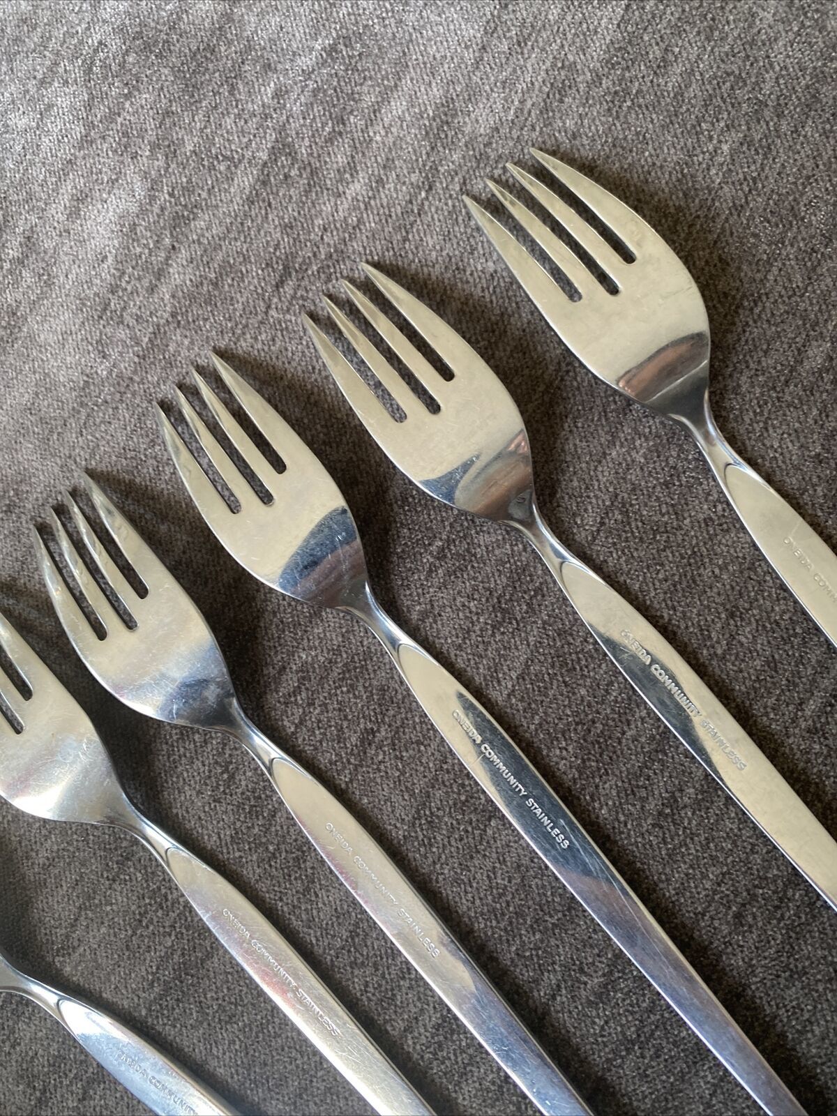 6! ONEIDA COMMUNITY STAINLESS SATINQUE Dinner Forks 7 3/8" 2 Sets Available.