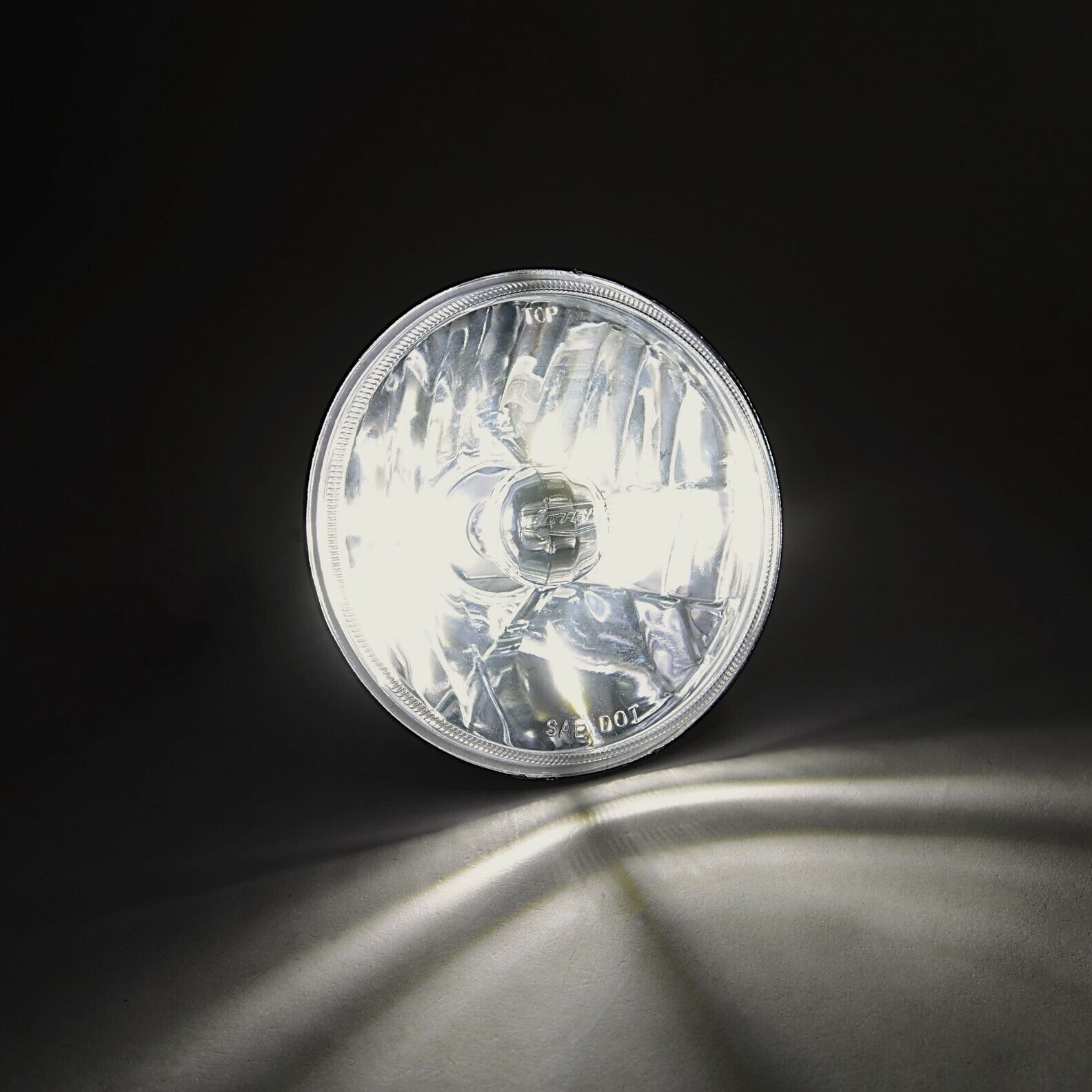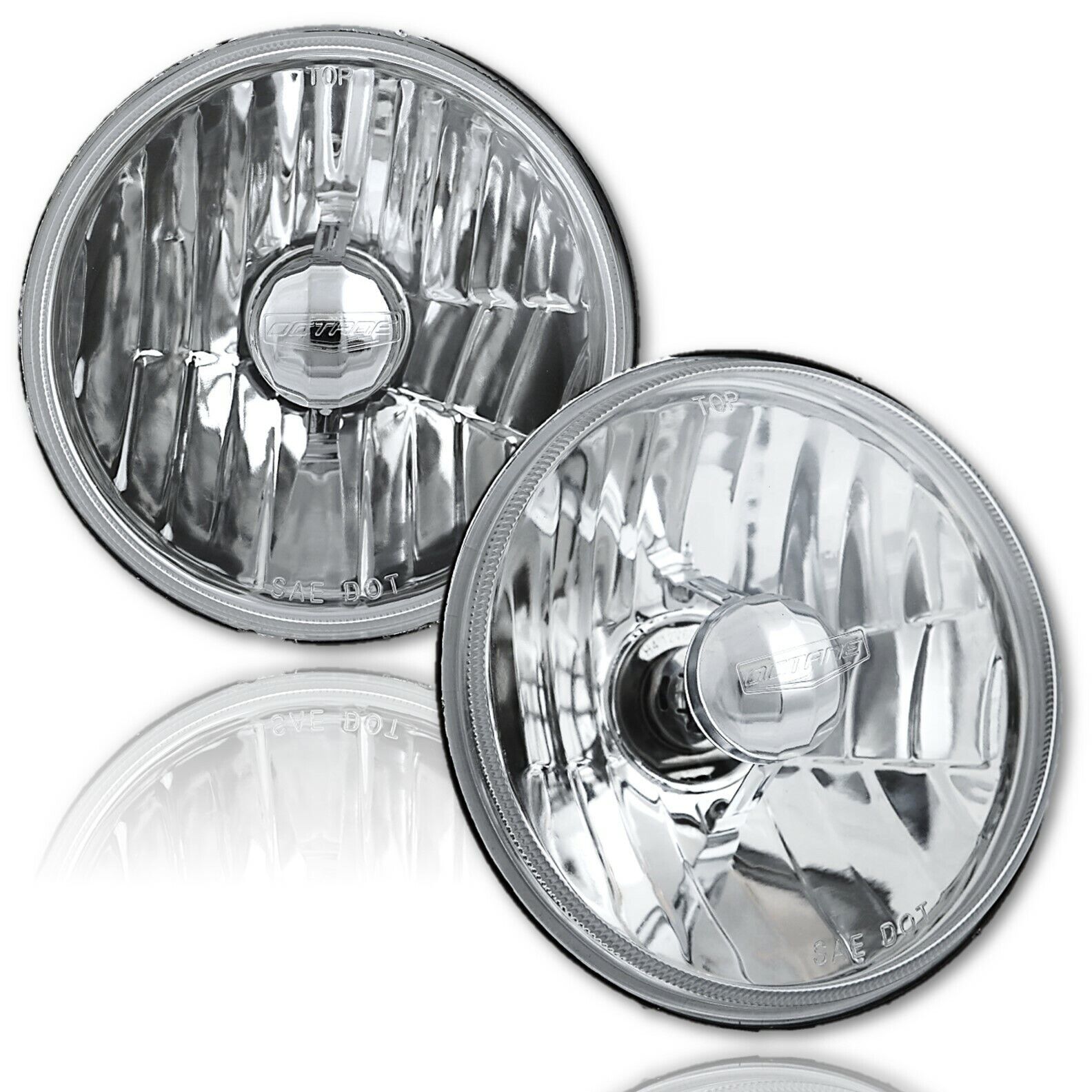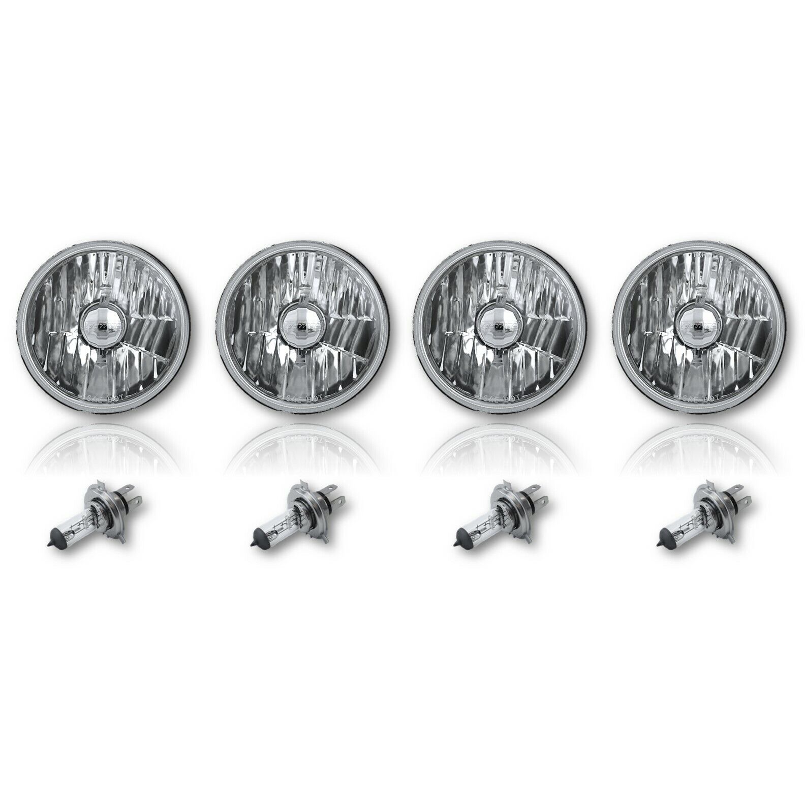 THIS LISTING IS FOR A NEW SET OF (4) 5 3/4" CRYSTAL CLEAR GLASS LENS - METAL BACK HALOGEN HEADLIGHT BULBS. THIS SET INCLUDES 4 LOW/HIGH BEAM HEADLIGHTS WITH 60W/55W HALOGEN LIGHT BULBS (NO WIRING OR BUCKET MODIFICATION NEEDED). THESE HAVE THE ORIGINAL SHAPED PRONGS ON THE BACK SO THEY WILL PLUG RIGHT INTO YOUR ORIGINAL WIRING HARNESS PLUGS. THESE WILL FIT ANY CAR OR TRUCK THAT HAS 4 ROUND GLASS HEADLIGHTS. WILL FIT INTO STOCK BUCKETS. EACH BULB IS 5 3/4 INCHES IN DIAMETER. THESE ARE GLASS AND WE WILL TAKE EXTRA CARE IN PACKAGING. DOT SAE APPROVED.