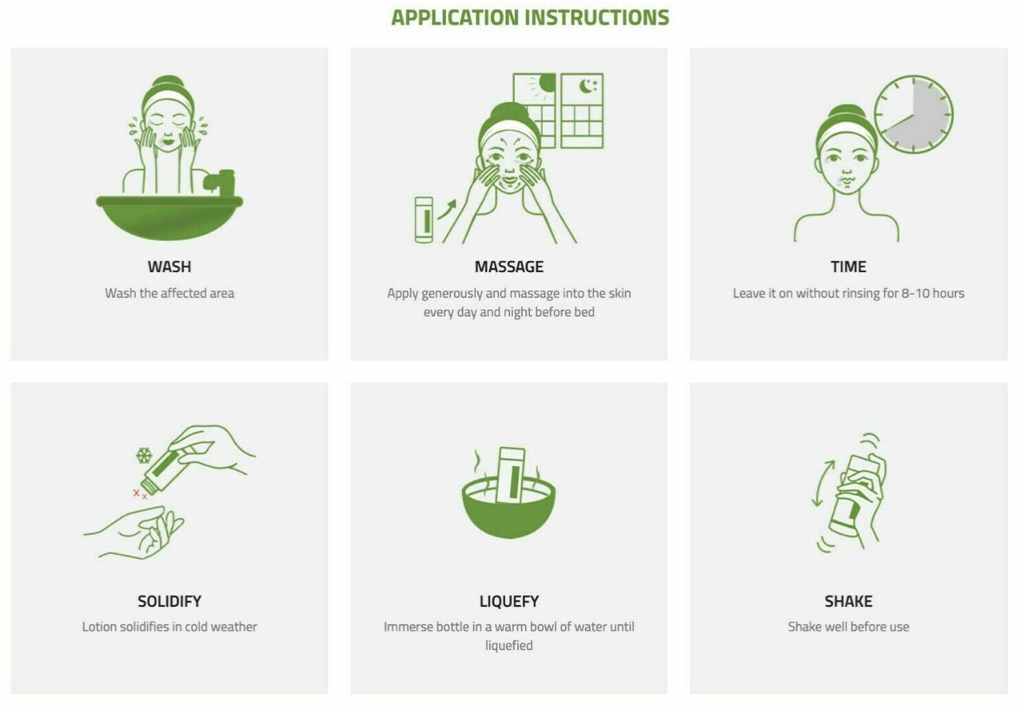 1. Wash Clean the skin with a mild soap or soap-free cleanser, rinse with water then apply generously and massage into the skin every day and night before bed.
