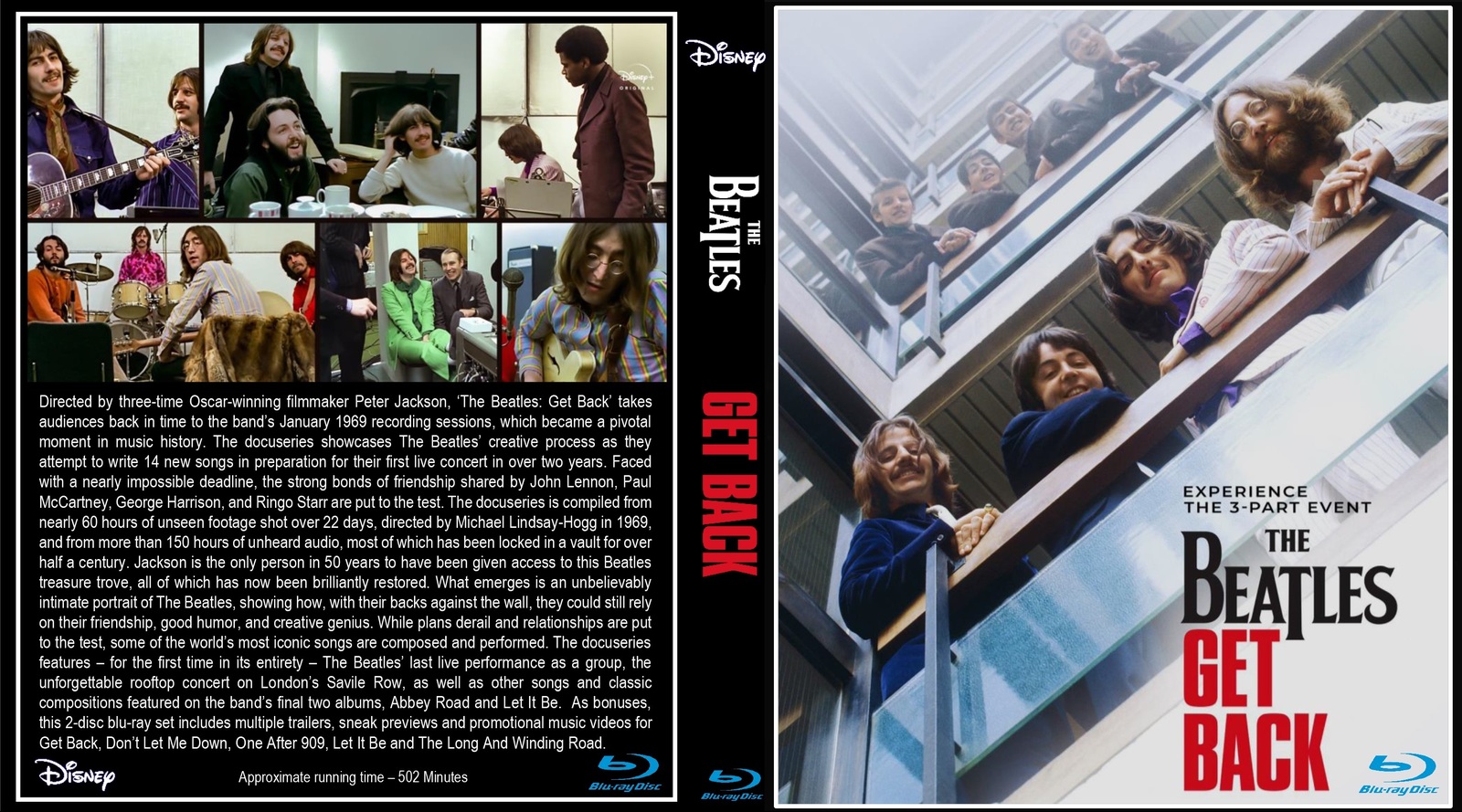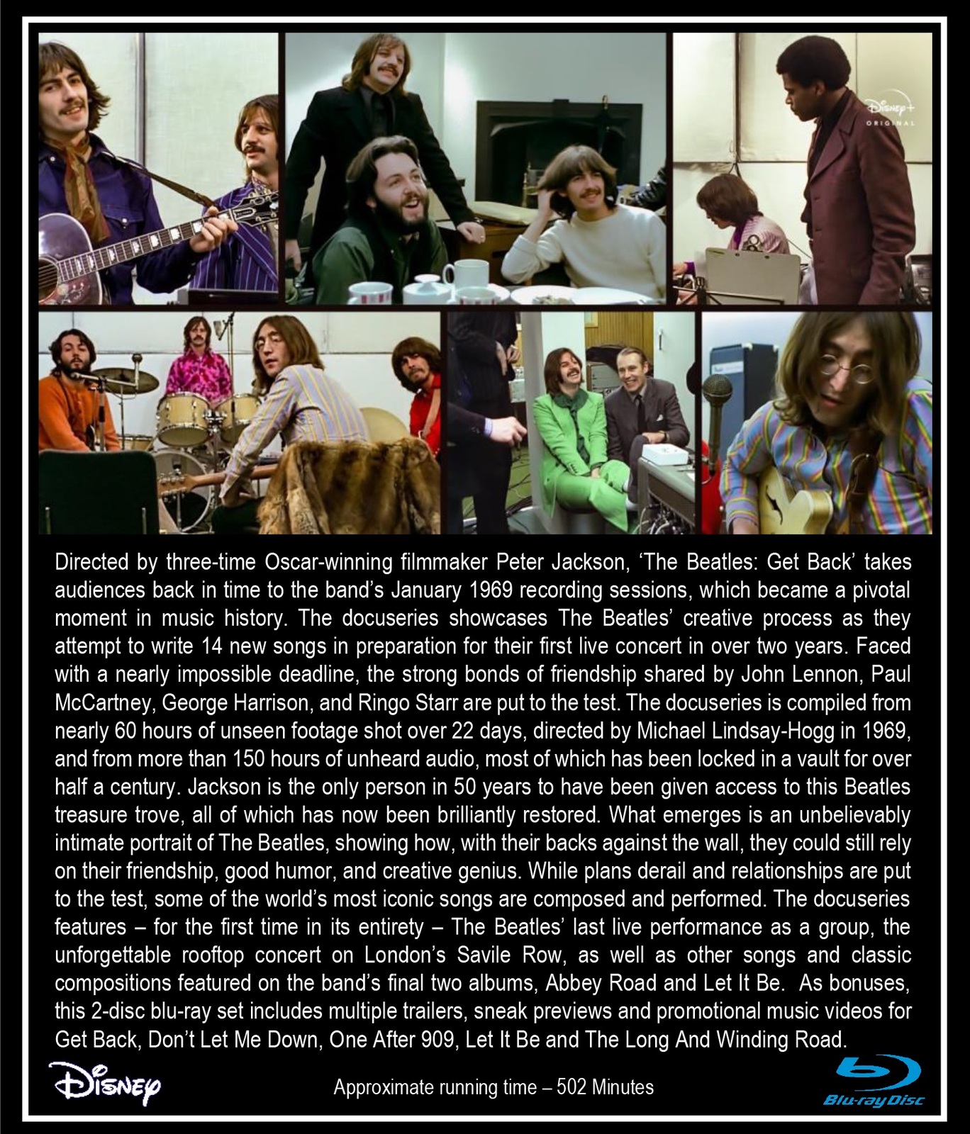 The Beatles 2021 documentary Get Back. Directed by Peter Jackson. Two blu-ray discs with bonus material. 502 minutes (over 8 hours). 5.1 Surround sound. Directed by three-time Oscar-winning filmmaker Peter Jackson, ‘The Beatles: Get Back’ takes audiences back in time to the band’s January 1969 recording
