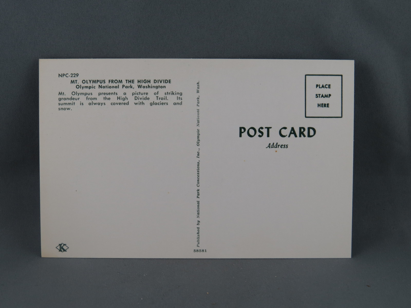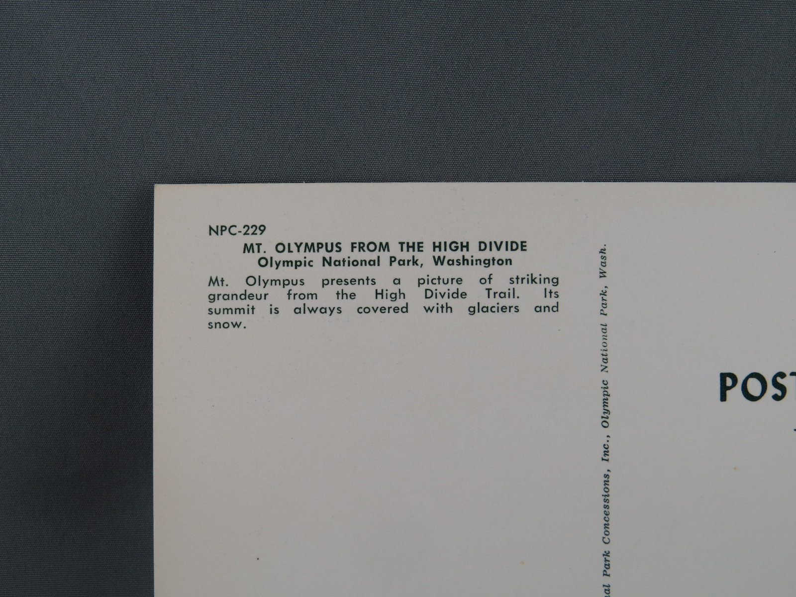 Up for sale is a vintage postcard. It features an image of Mount Olympus from the High Divide in Olympic National Park. What a great addition to any colleciton.