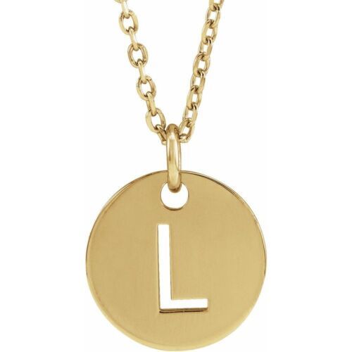 This adorable and stylish round disc with cut-out initial 'L' pendant is crafted of 14K Yellow Gold and suspends from a matching cable chain that measures 16-18 In ches long. The chain secures with a spring ring clasp.