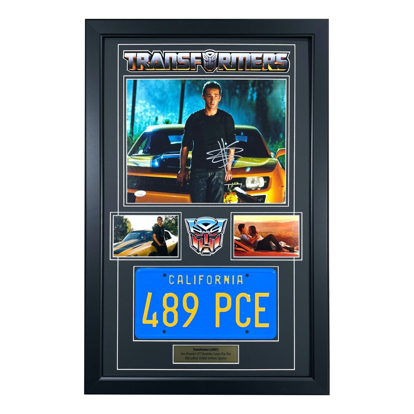 Shia LaBeouf Autographed "Transformers" Framed Licensed Plate Collage!! This is a must-have for the man cave as this collage features a hand signed 11" x 14" photograph by Shia LaBeouf himself with an unsigned license plate from Sam Witwicky's car, the 1977 Bumblebee Camaro in the hit 2007 blockbuster film!! The replica metal license plate is a full-size stamped license plate you would see on any vehicle on the road and measures approx 12" x 6" in size. If you are a big fan of the iconic movies or specifically this "Movie Car", well then this item is for you!! Please note this license plate is not screen used just a replica of the one you would see in a movie! This professionally custom framed collage features 4"x 6" photos, a gold nameplate depicting information about the "movie car", a Transformers banner at the top of the frame, museum-quality double matting amp; a plexiglass display with a black frame measuring approximately 32" x 21" x1" in size!! This autograph is certified authentic by James Spence Authentication (JSA), one of the largest amp; most reputable authenticators in the industry. This piece includes the JSA tamper-proof authentication sticker and identification card directly from them, which can also be accessed anytime/anywhere on their online database on their website. Note: The item listed in this listing is a stock photo, and you will receive a comparable item to the one pictured. Autograph location may vary as well as the size, color pen used and signature quality.