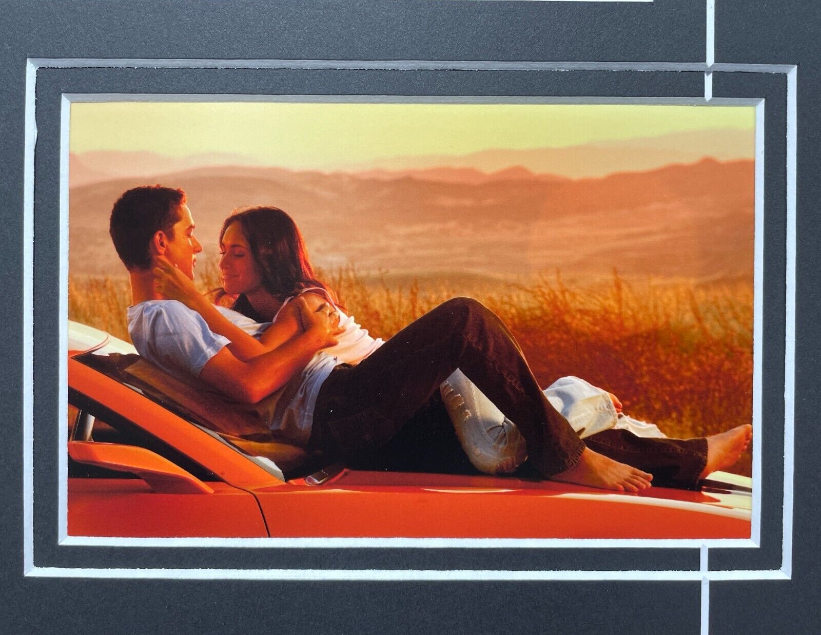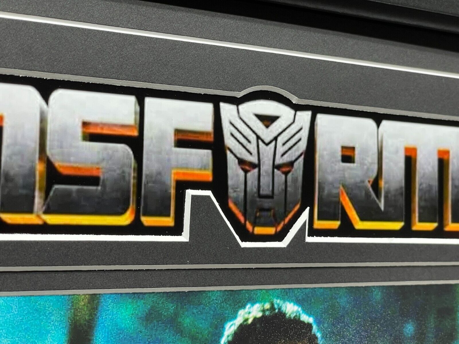 This professionally custom framed collage features 4"x 6" photos, a gold nameplate depicting information about the "movie car", a Transformers banner at the top of the frame, museum-quality double matting a plexiglass display with a black frame measuring approximately 32" x 21" x1" in size!!